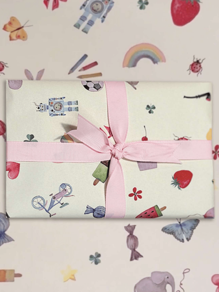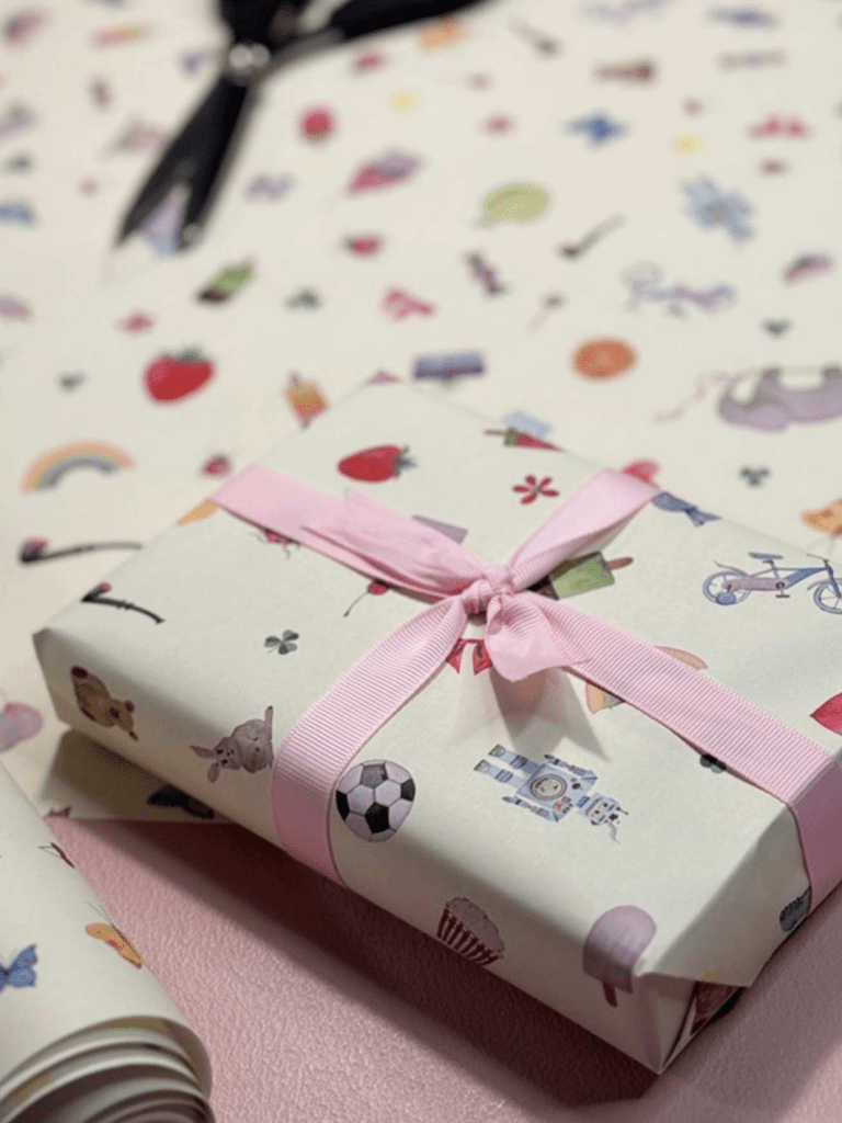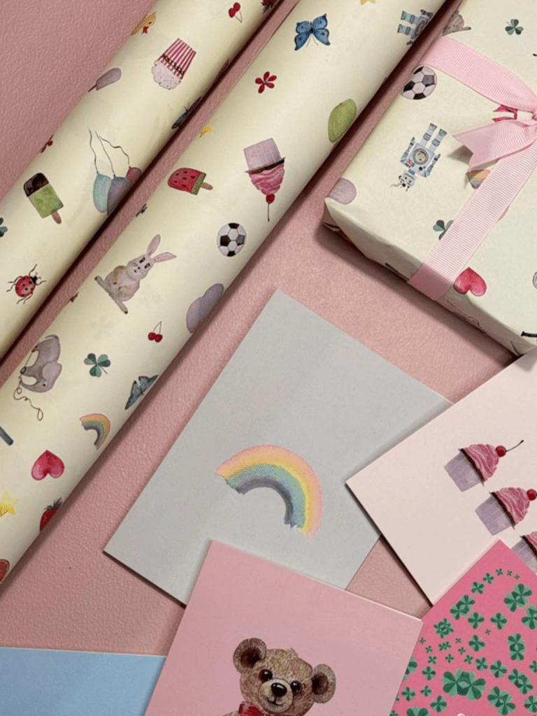 På gavepapiret finder du tryk af forskellige originalværker i akvarel – sat op i en grafisk komposition, der klæder gavepapirets format.