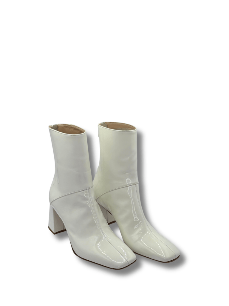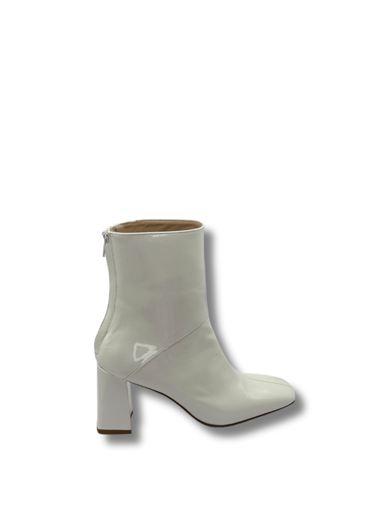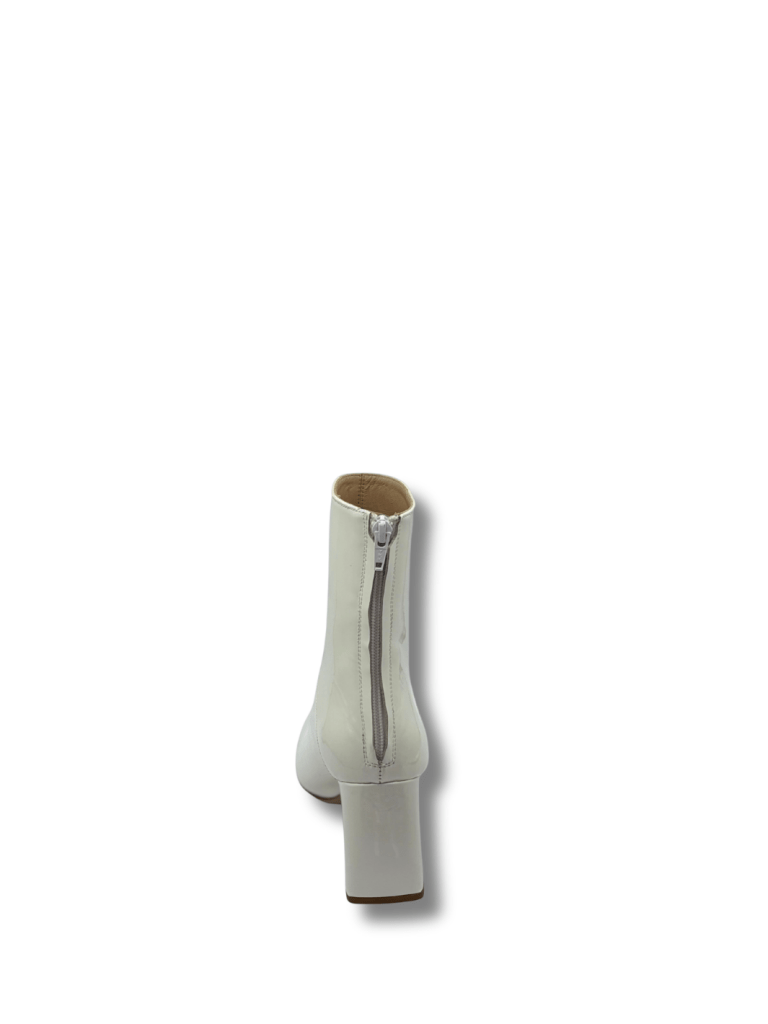 Apair Hvid Corfu Højhælet Støvle. Kort støvle med hvide lynlåse bagpå hver støvle. Støvlen er lavet af skind og lakeret. Med en robust hæl. Utrolig smuk støvle, perfekt til et festligt påklædning.