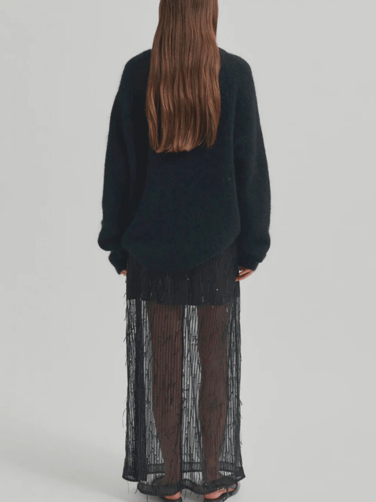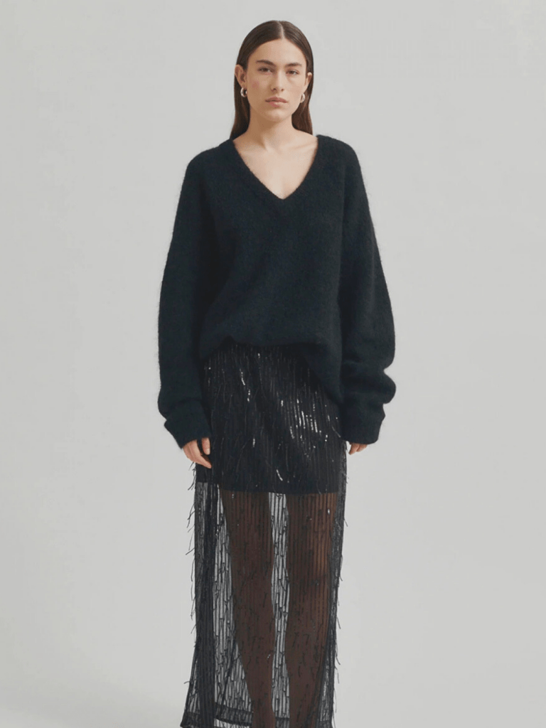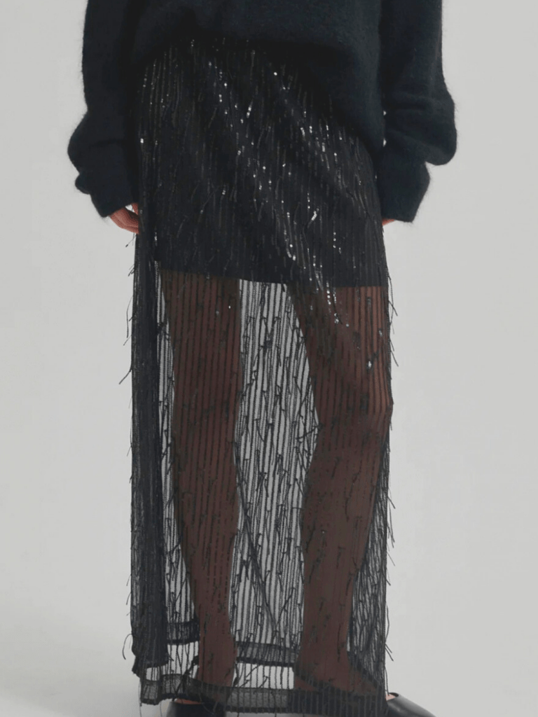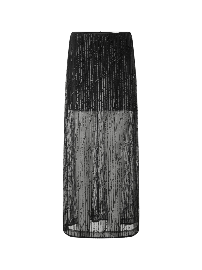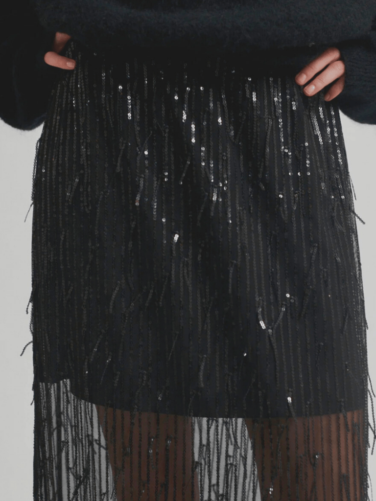 Giv dit outfit et strejf af glamour med denne smukke lange Second Female Tassel nederdel pyntet med sorte pailletter, der fanger lyset på smukkeste vis. Nederdelen har høj talje, elastisk linning og skjult lynlås for perfekt pasform. Det lette, transparente materiale og den korte undernederdel skaber et feminint og elegant udtryk – ideel til festlige lejligheder og aftenens look.