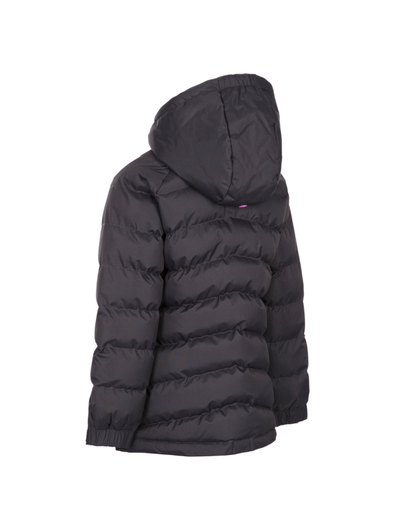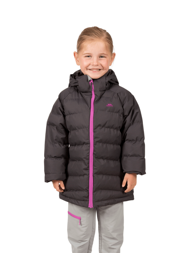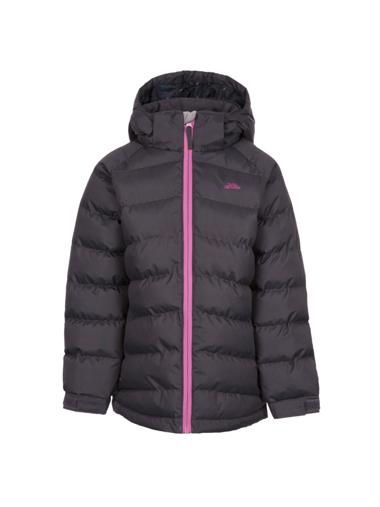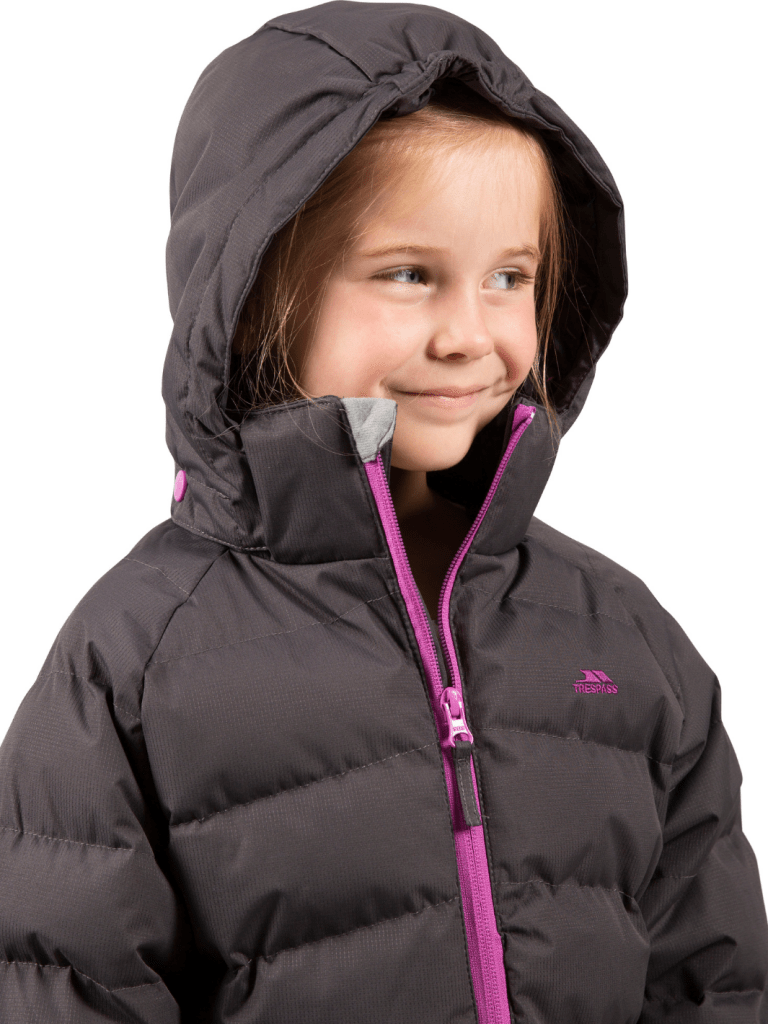 Koksgrå Amira pigejakke fra Trespass, en vind- og vandtæt jakke designet til både hverdag og udendørs eventyr. Med en vandtæthed på 2000 mm,pink kontrast lynlås, aftagelig hætte og et polstret quiltet design, giver den både beskyttelse og komfort i al slags vejr.