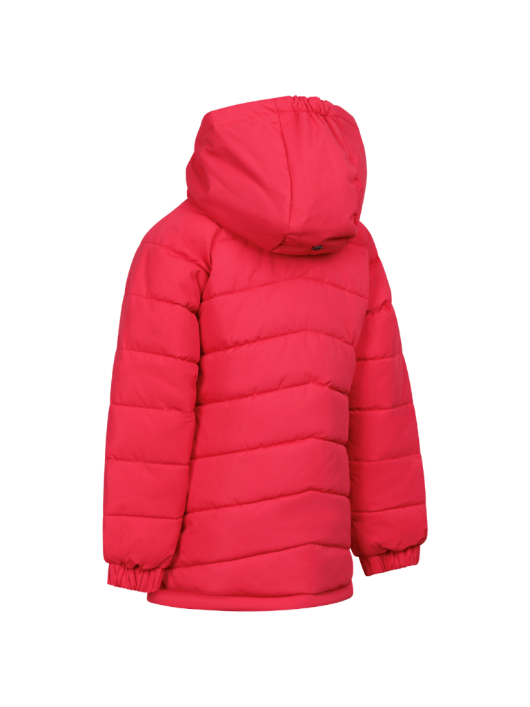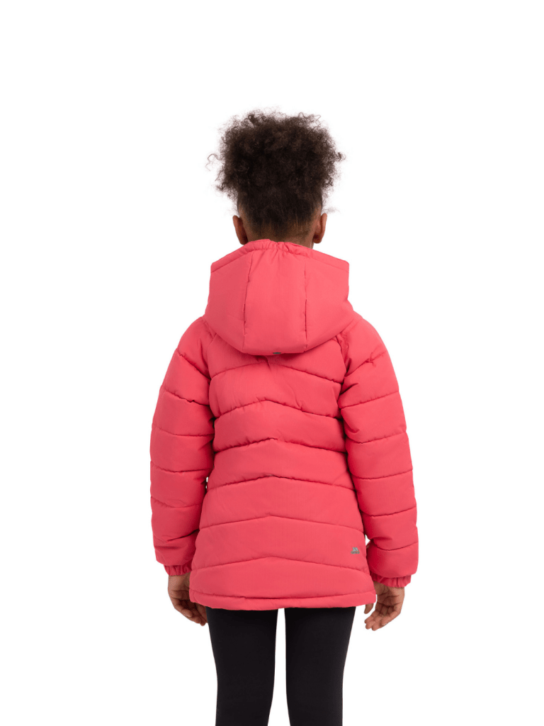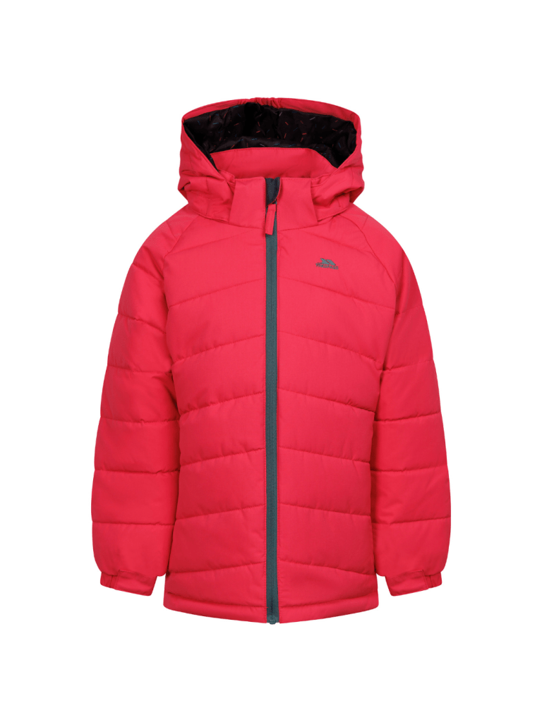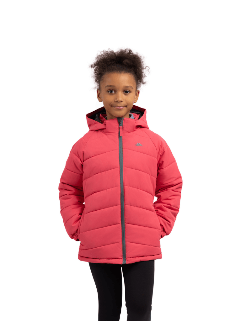 Rød Amira pigejakke fra Trespass, en vind- og vandtæt jakke designet til både hverdag og udendørs eventyr. Med en vandtæthed på 2000 mm,pink kontrast lynlås, aftagelig hætte og et polstret quiltet design, giver den både beskyttelse og komfort i al slags vejr.