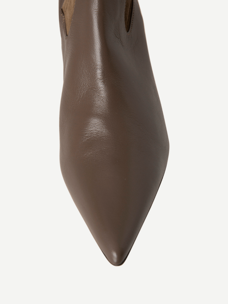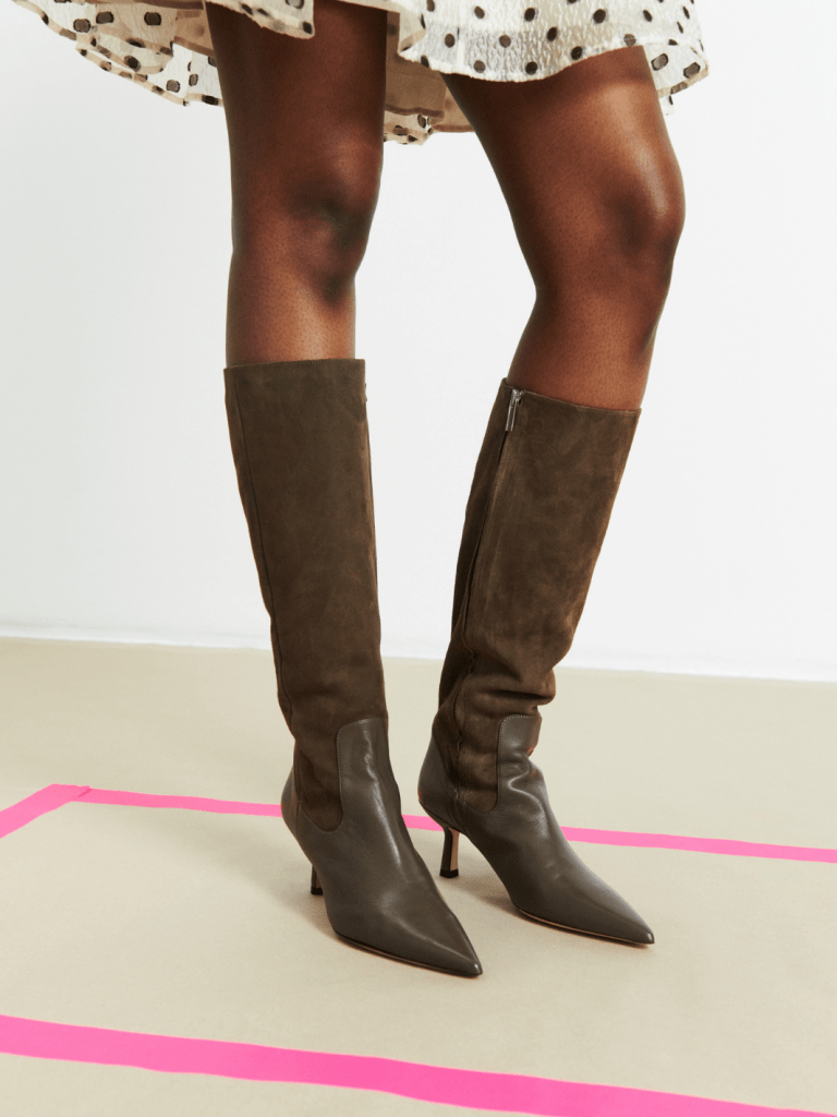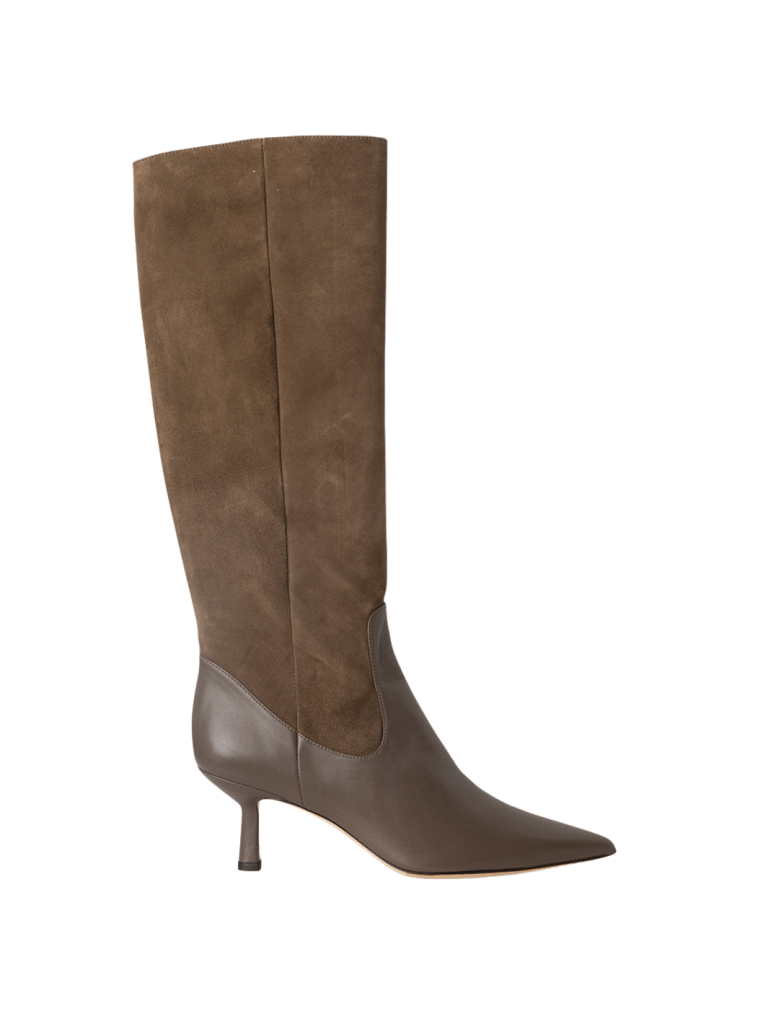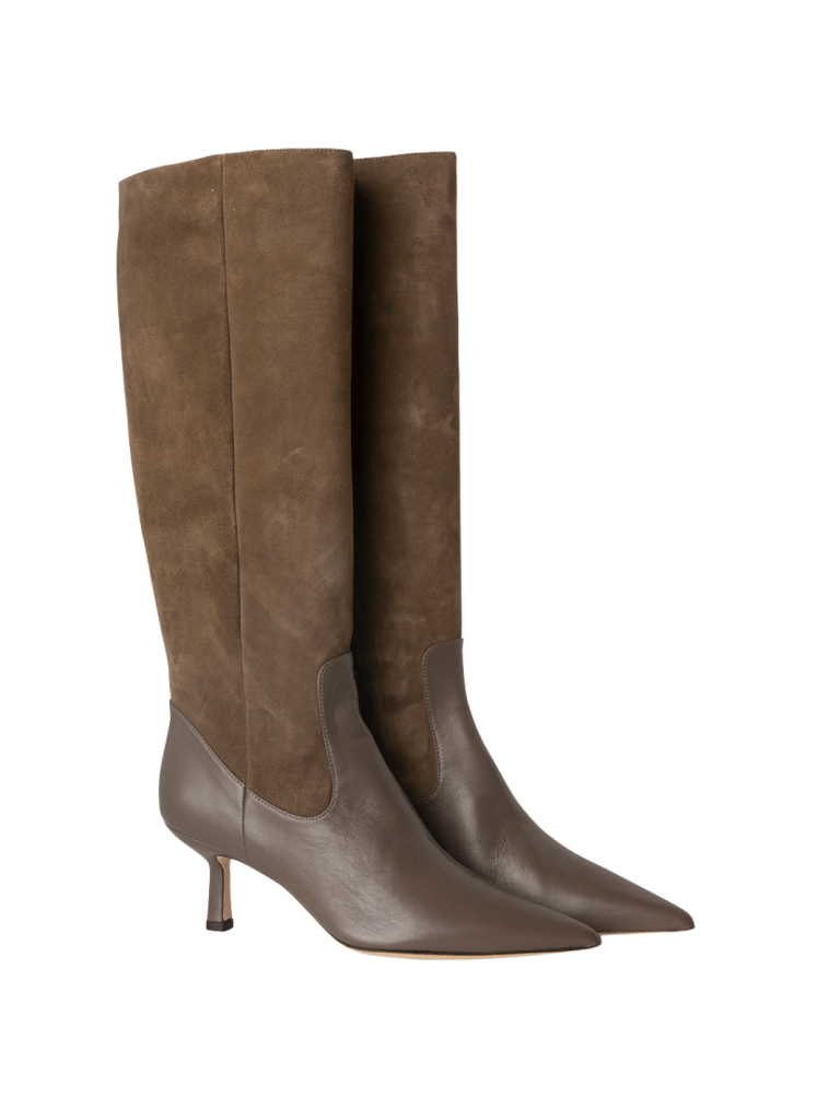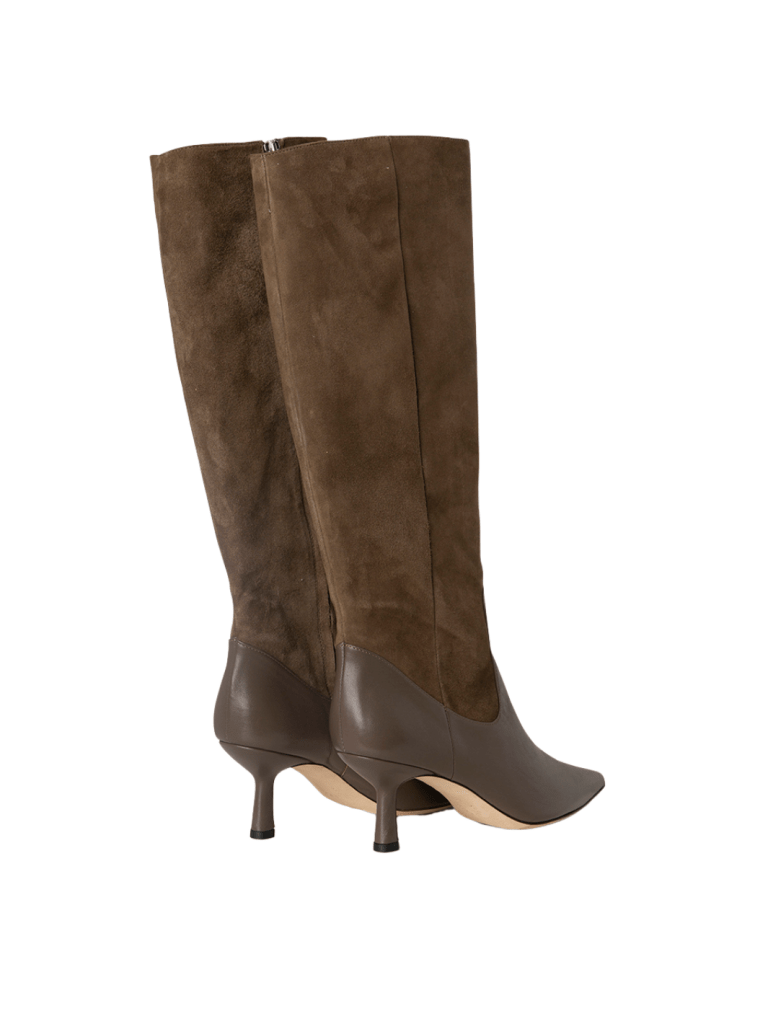 Brun lang Ally Custommade støvle, produceret i ruskind og glat skind. Den har en hælhøjde på 6,5 cm, og indvendig lynlås. En flot og elegant støvle til alsidig brug.