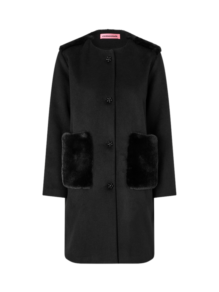 Smuk sort Halli Custommade frakke med et ekstra touch. Denne smarte Frakke er dekoreret med krystalknapper, samt påsyede front lommer- som i ægte Custommade-karakter. Fremstillet i uld-polyester.