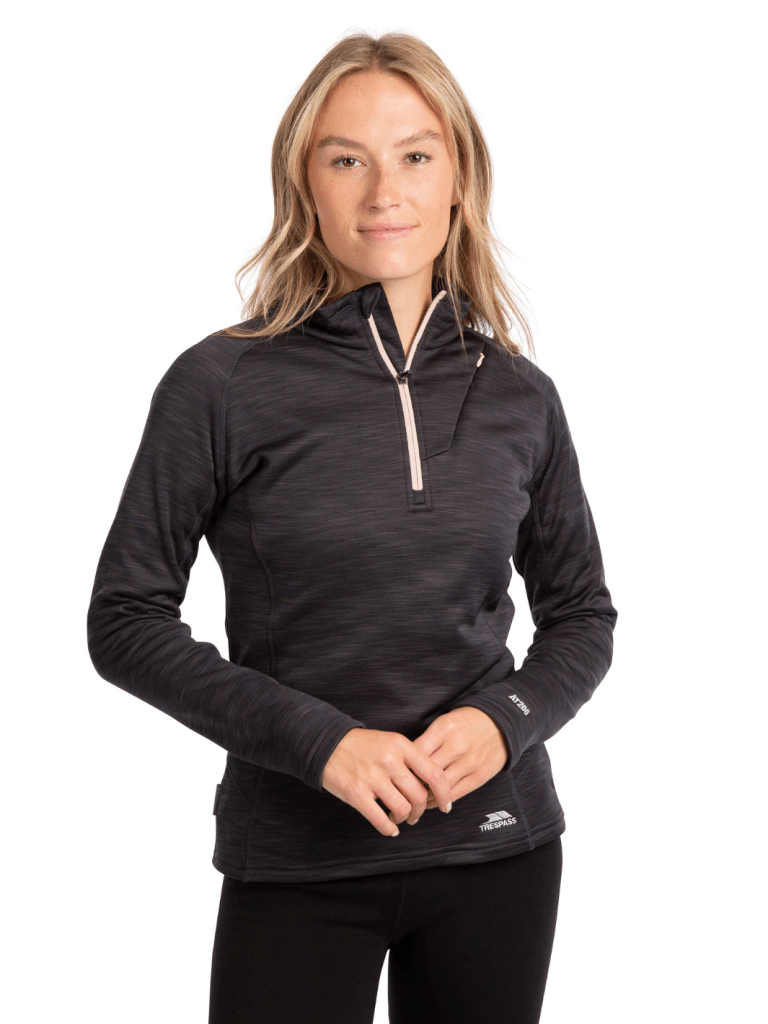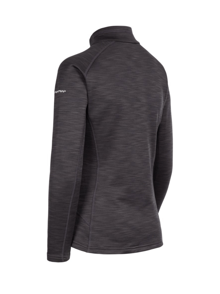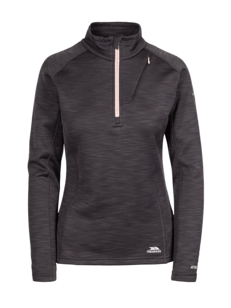 Sort Trespass second layer fleece. Meleret glat overflade og børstet fleece på bagsiden. Med lyserød Lynlås og lille lomme ved hals. Lækker blød kvalitet.