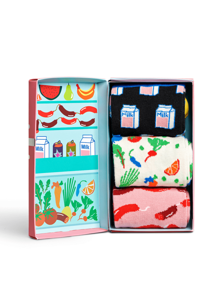 Fin 3-pack Gaveæske til den mad elskende. 3 farver, Lyserød, Hvid, Blå , alle med motiver af forskellige mad og mælk. Den perfekte gave til den kræsne , eller den smarte hipster. En sjov gave til den altid sultne.