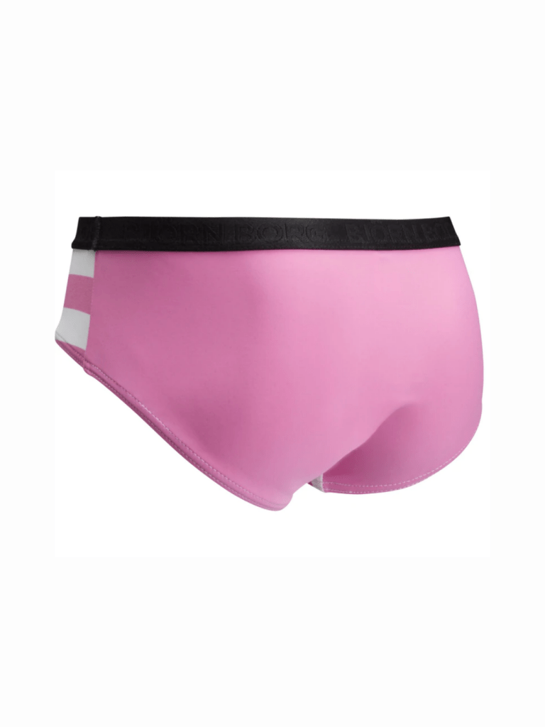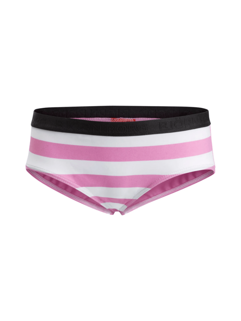 Björn Borg Pige Swim Hipster med sort logo elastik i microfiber for perfekt comfort.  Lyserød/hvidstribet front og ensfarvet lyserød på bagen. Tørrer hurtigt.