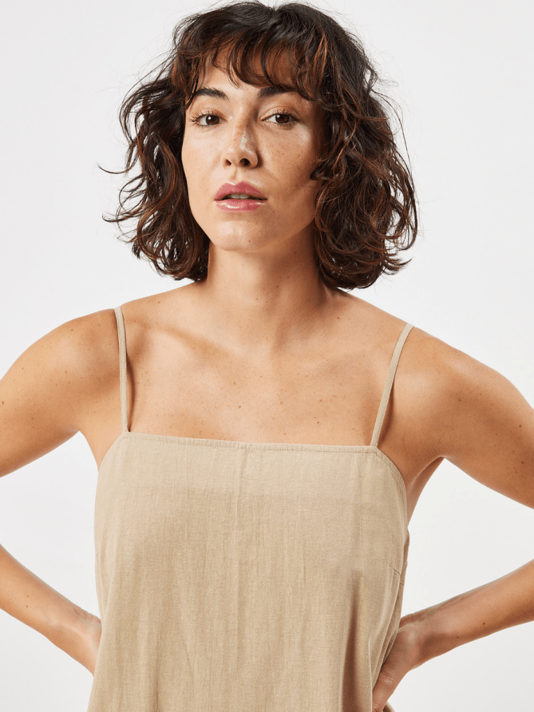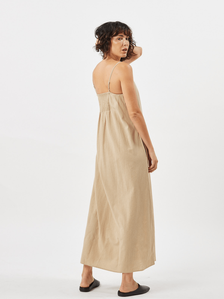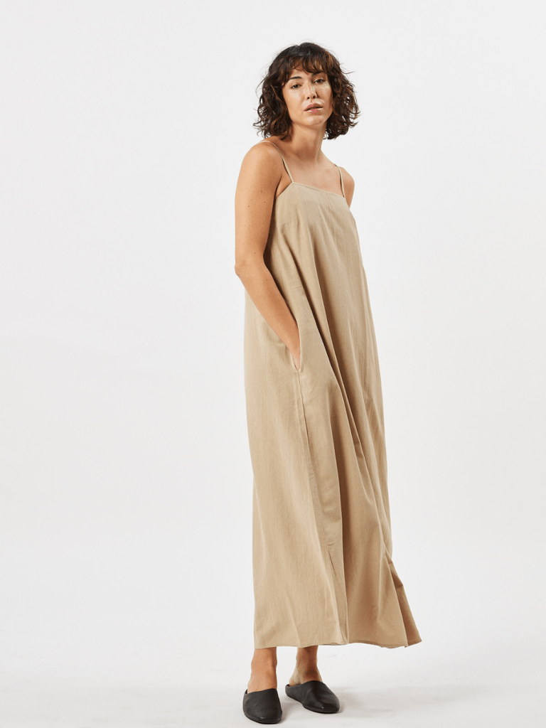 Beige Lang Vikilino kjole fra populære Moves by Minimum, lavet af bomuld og viskose for en let og blød kvalitet. Kjolen har en løs pasform og har lommer i siden, tynde stropper og smockdetaljer bagpå for en mere tætsiddende overdel af kjolen.