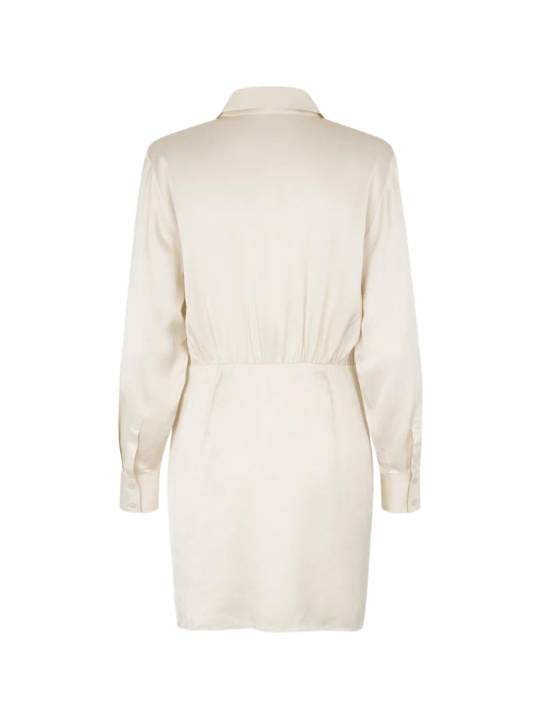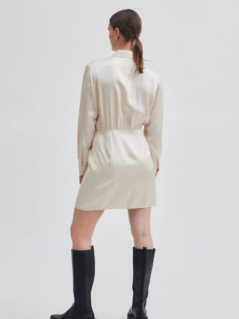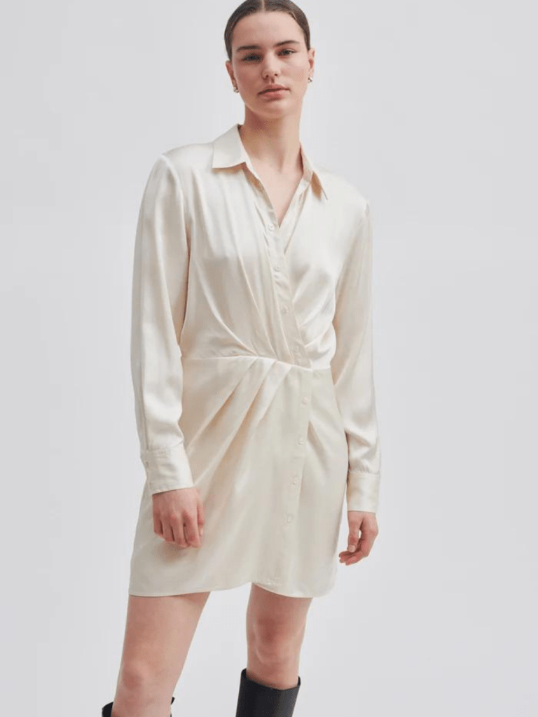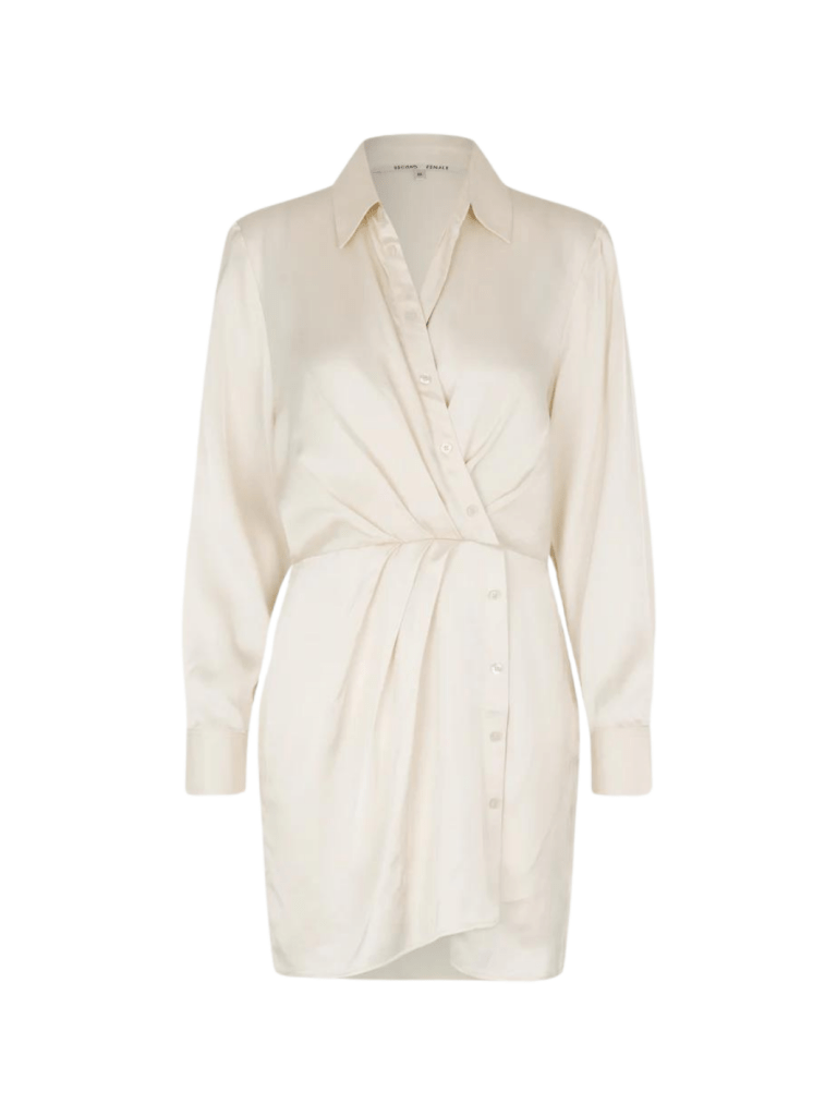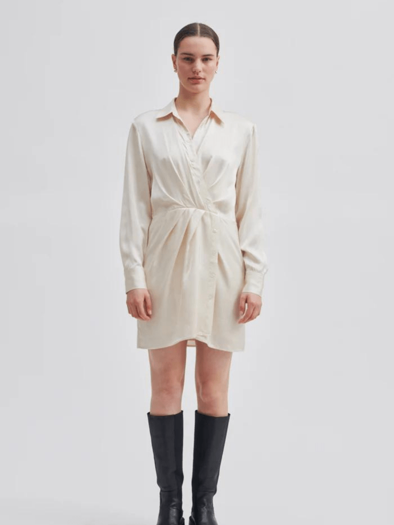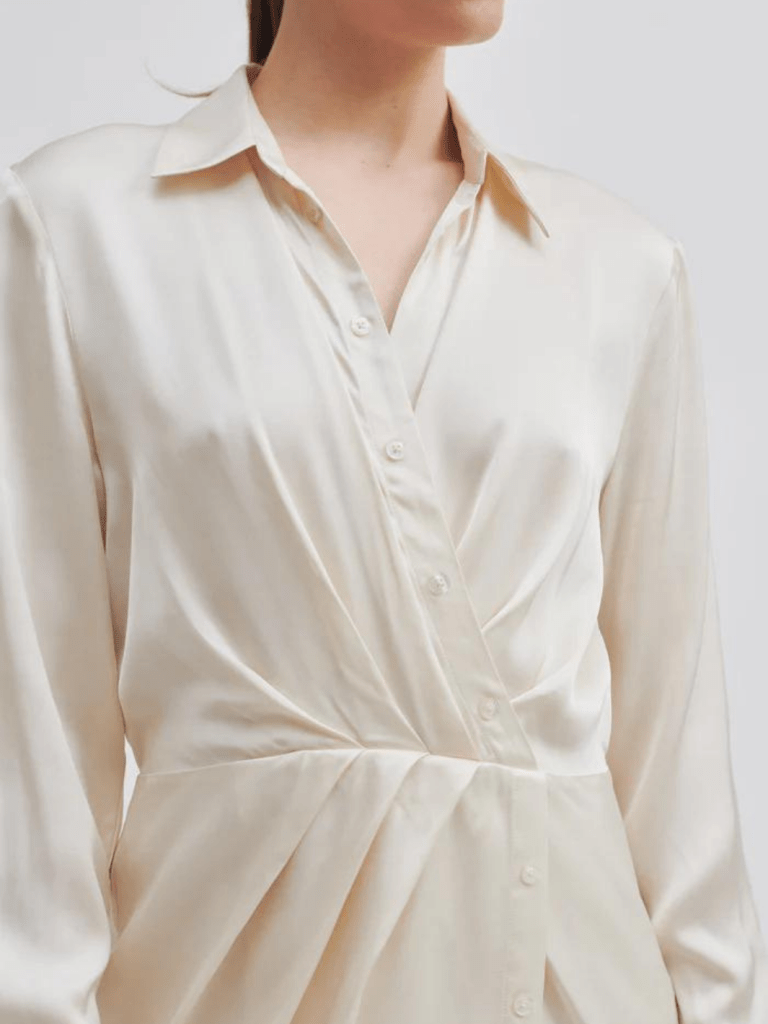 Cremefarvet Second Female Break Skjortekjole. Silkeblød viskose med fin drapering. Krydsudskæring i skjortestil med knapper ned langs siden. Skjult lynlåslukning i siden. Plisserede detaljer foran og lange ærmer med knappede skjortemanchetter. Normal pasform og figursyet talje og lige nederdel.