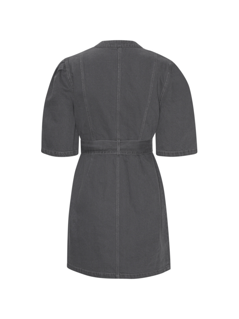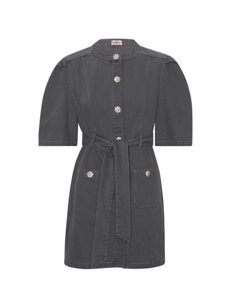 Koksgrå Junie Custommade denimkjole i twill med glitrende knaplukning, puf på skulderen, påsyede lommer og bælte i taljen. Perfekt til sommeren !