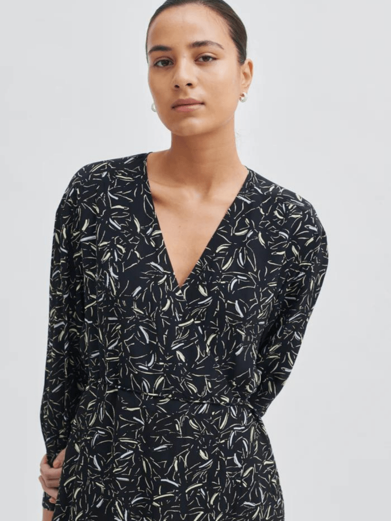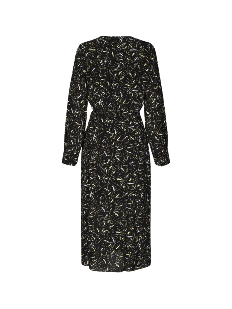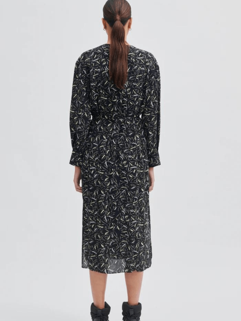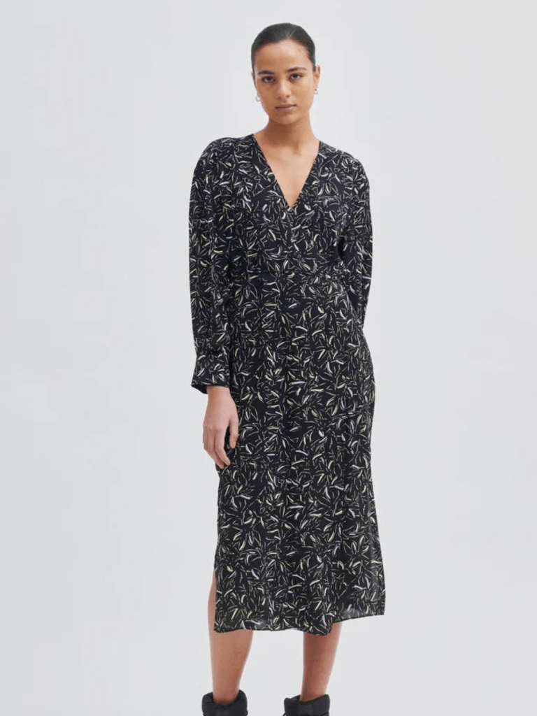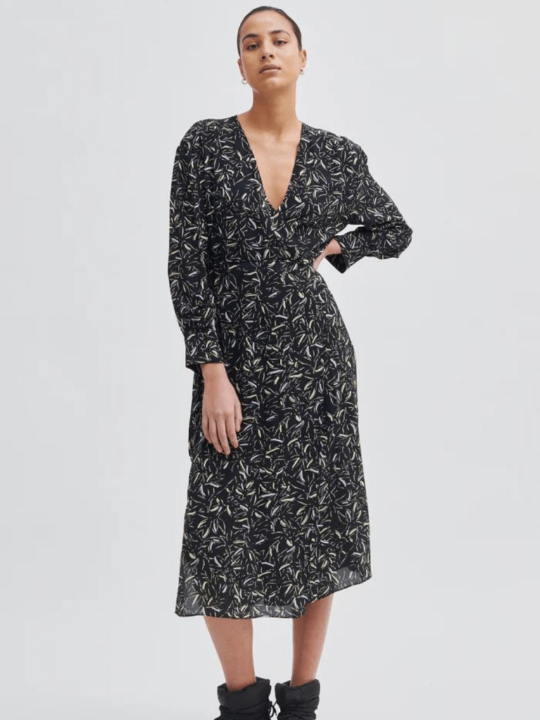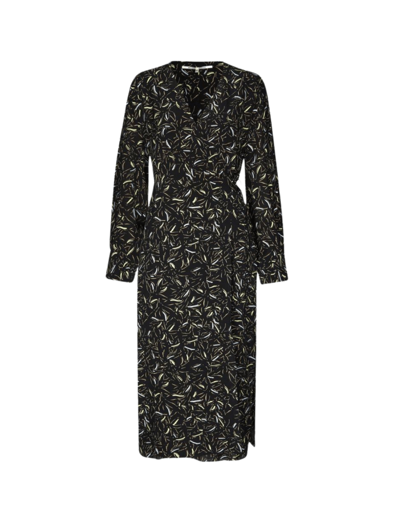Sort Mønstret Second Female Tour slå om-kjole med lange ærmer. Fremstillet i blød viskose med mønster. V-udskæring med slå om, der krydser foran. Derudover Bindebånd i den ene side, lange ærmer med skjortemanchetter og høje slidser i begge sider. Foret til knæene. Normal pasform foroven med løsere, bølgende skørt.