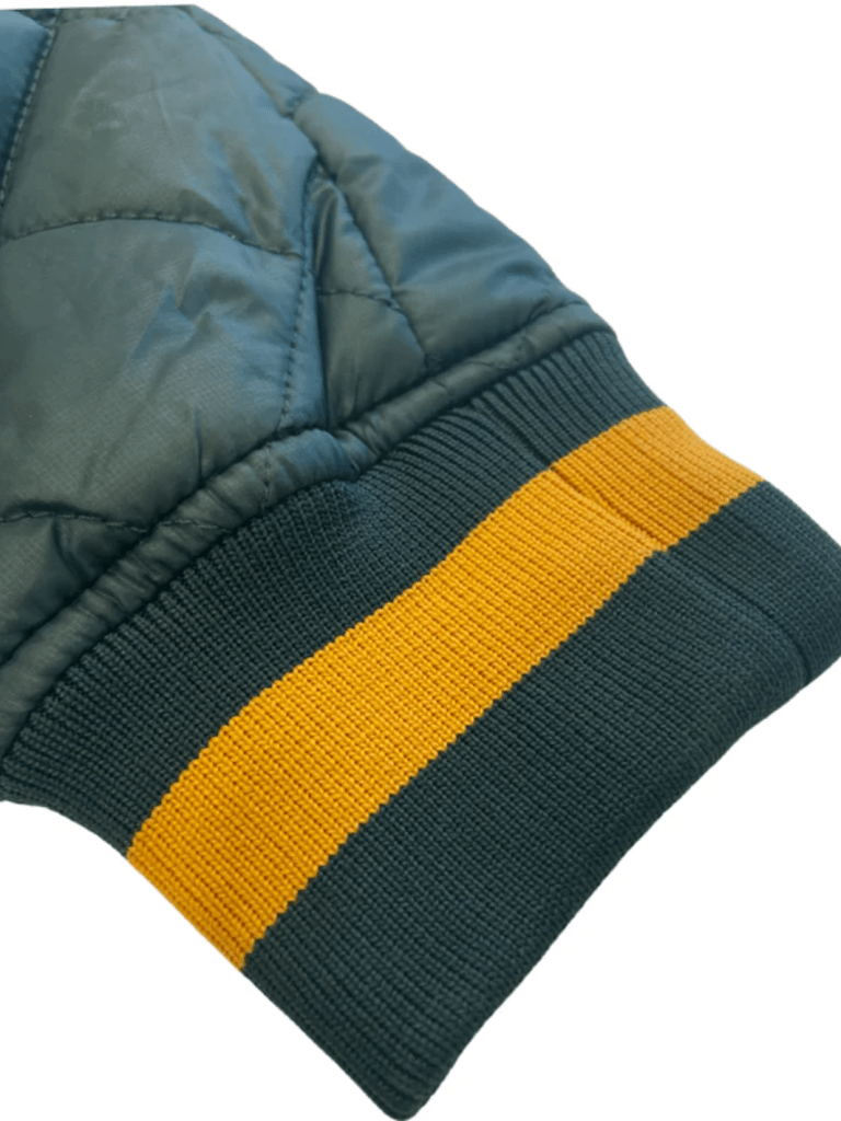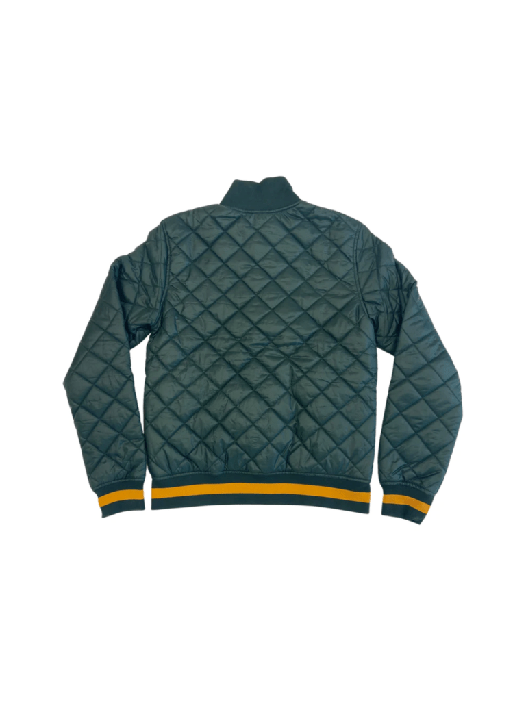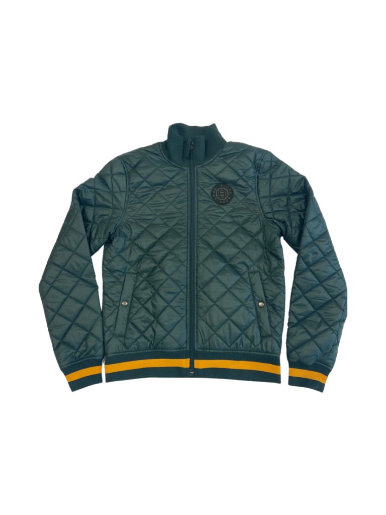 Grøn kviltet Björn Borg herre jakke med gennemgående lynlås, to sidelommer med knap lukning. Mindre rundt logo på bryst, og inderlomme.  Desuden strikket rib i hals, ærmer samt linning, med gul kontrast strib.