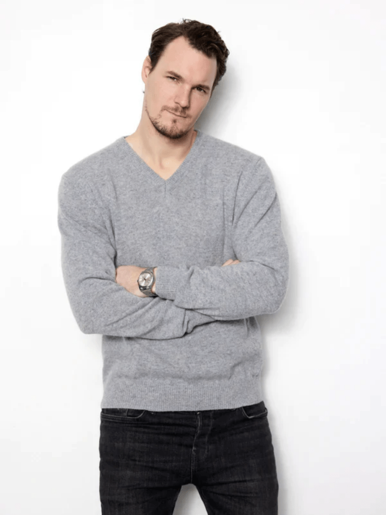 Lys grå v-hals fra A New Story. Denne klassiske og tidløse striktrøje til mænd er lavet af genbrugsuld af høj kvalitet. Ved at bruge genbrugsmaterialer reducerer vi ikke kun tekstilaffald, men vi sparer også energi ved at reducere det CO2-aftryk, der ville være blevet udvidet i produktionen af nye materialer.