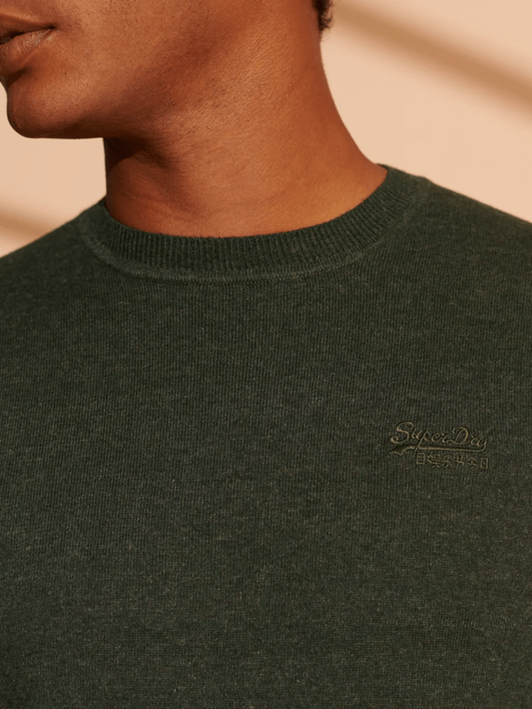 Grøn meleret Superdry Herre strik, med rund hals og tynd strikket rib i hals og ærmer. Produceret i Bomuld og Kashmir, for en dejlig blød og behagelig komfort. Perfekt som ekstra lag til de kolde dage.