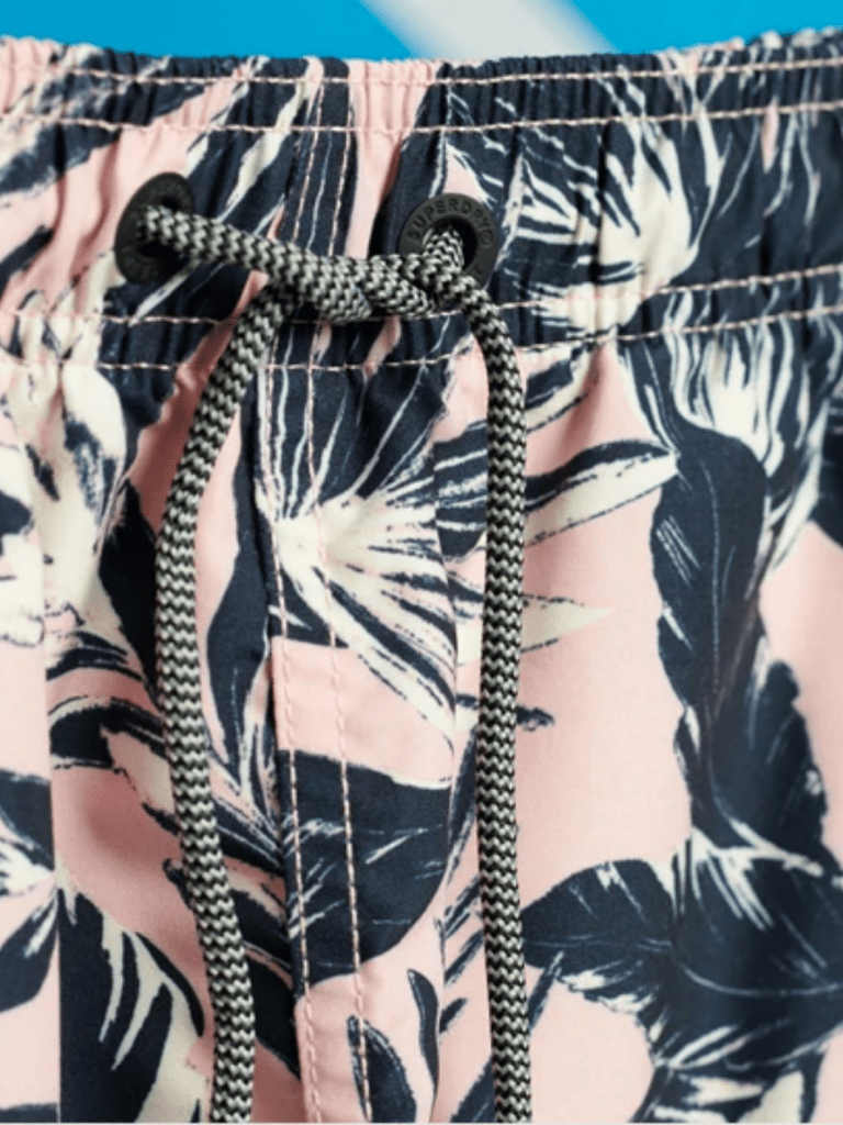 Lyserød Palmemønstret Superdry Herre badeshorts, med snortræk, to sidelommer baglomme med lynlås, samt mesh indershorts. Lille logo på lår. Hurtigt tørrende.