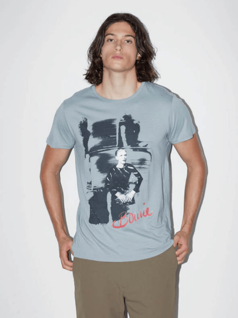 Lys blå 360° ICÔN Herre T-Shirt med fortolkningsprint af den legendariske David Bowie. Produceret i Portugal af OEKO-TEX® Standard 100 certificeret stof og print. Slim fit model