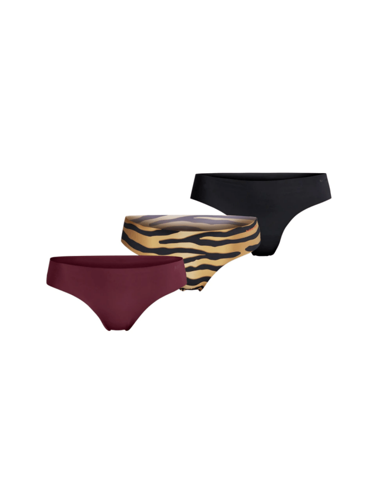 3-pack String trusse, produceret i blød microfiber. Pakken består af en Bordeaux, ensfarvet sort samt en tiger stribet. Lavet med lasercut, så der er ingen syninger der gnaver.