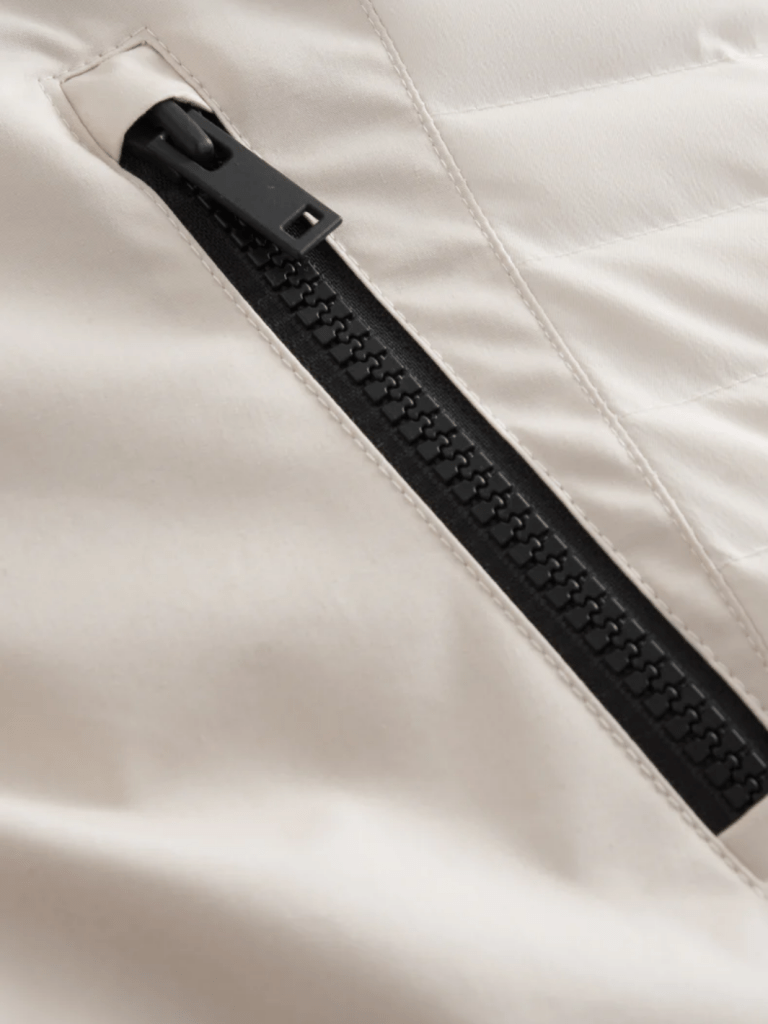 Sandfarvet SOS Leia dun vest, med to fronlommer med lynlås, stor split hætte med snortræk og høj hals. Vatterede side paneler og hætte samt justerbar talje. Derudover to inderlommer, hvor der i den ene er elastik snor med pudseklud til briller.