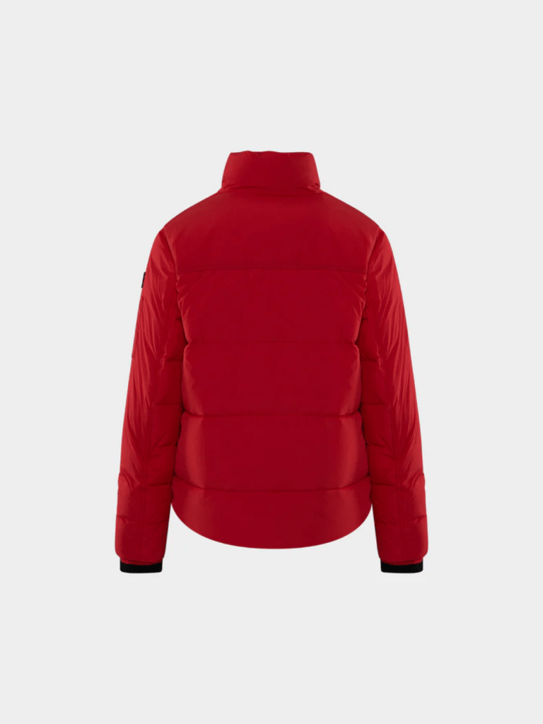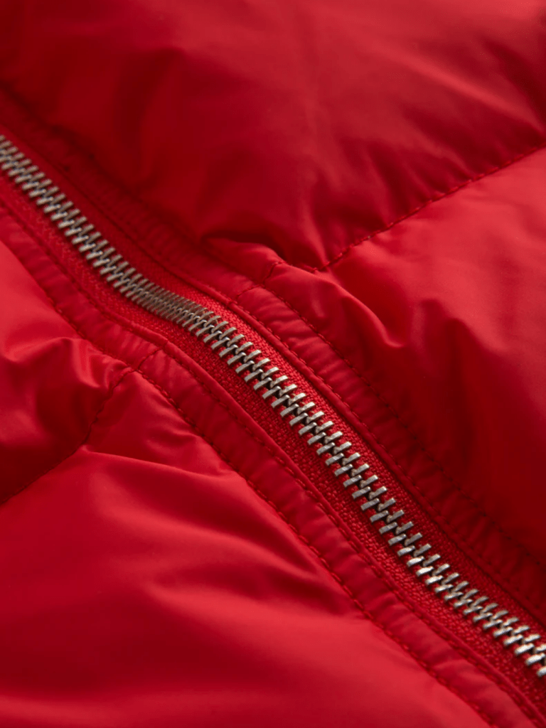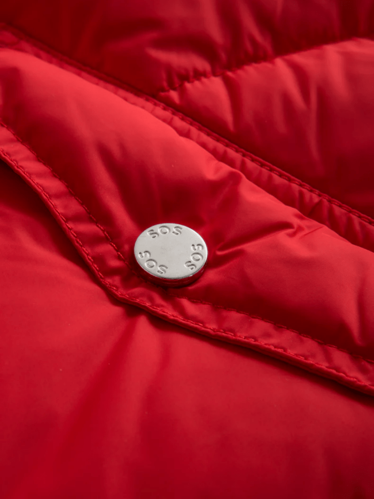 Rød SOS dunjakke, med kraftige metal lynlåse, snefang, strikkede manchetter på ærmer. Der er lomme på armen, samt to sidelommer med lynlås og knaplukning, og mindre inderlomme med lynlås. Desuden snor træk i taljen, med stopper.