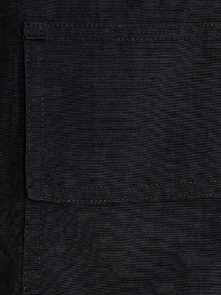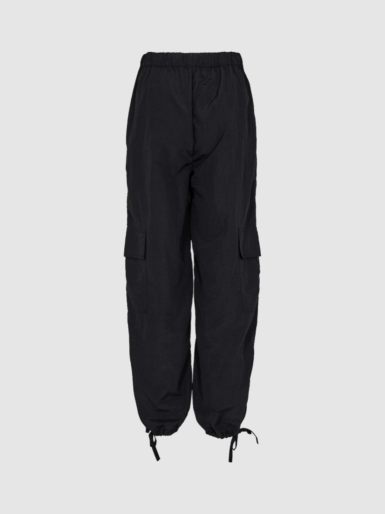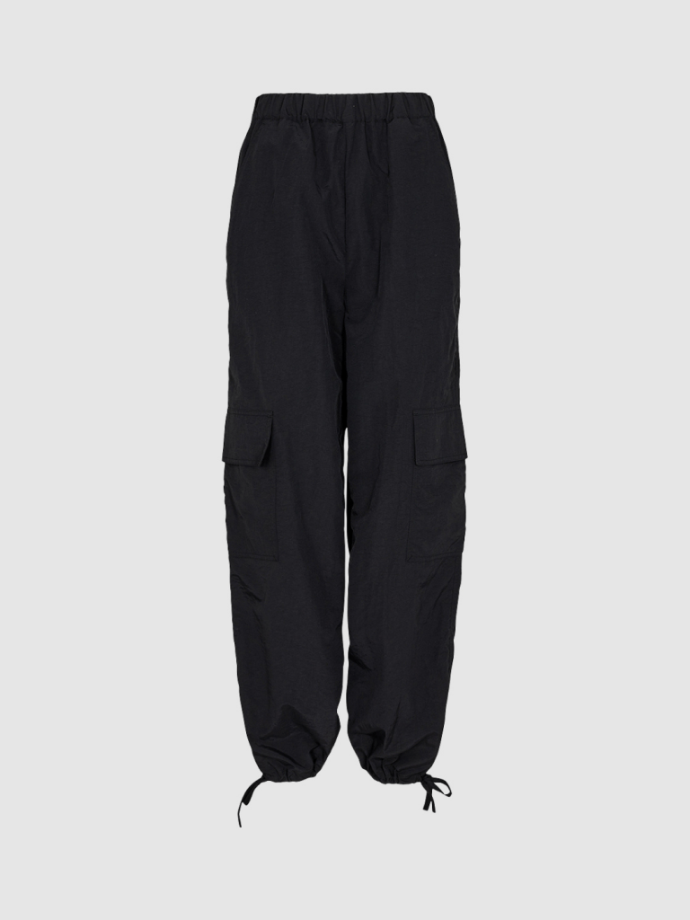 Sort Moves By Minimum Bargo cargobukser i faldskærmskvalitet. Lavet af nylon. Bukserne har en løs pasform og lige ben. De er designet med justerbare snørebånd ved anklerne og lommedetaljer på siden af bukserne.