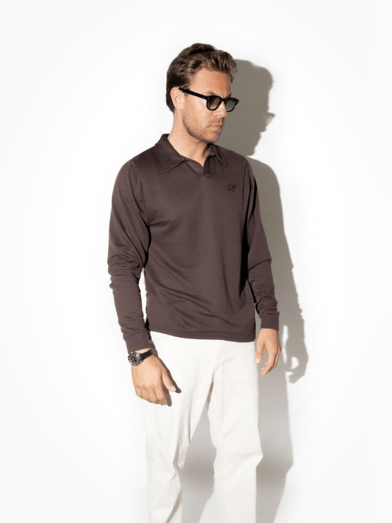 Brun mønstret Langærmet Polo er lavet på en specielfremstillet vævning. Materialet er blødt, fleksibelt og behageligt. Designet med åben krave og broderi på brystet. Perfekt til en alsidig hverdag, da den passer til alle tænkelige lejligheder. Designet med åben krave og broderi på brystet. Forvasket for at undgå krympning i vask. Produceret i Portugal