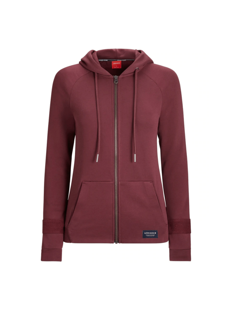 Bordeaux gennemlynet Björn Borg Hoodie, Skrå forlommer, hætte med snoretræk, samt rib i ærmer og talje samt Lille Björn Borg logo ved ribkant. Kan bruges til både træning og hverdag.