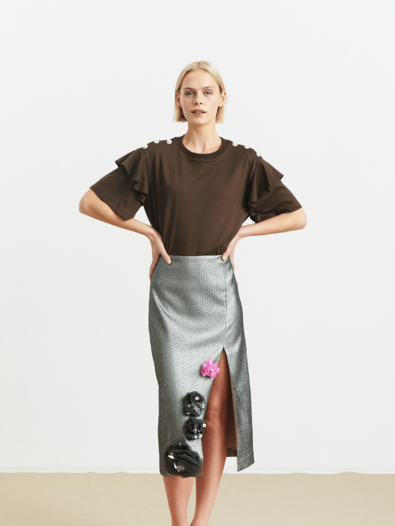 Brun Martina Custommade T-shirt med et ekstra touch. Denne smarte T-shirt har flæsede ærmer og er dekoreret med krystalknapper på toppen af skuldrene - som i ægte Custommade-karakter.