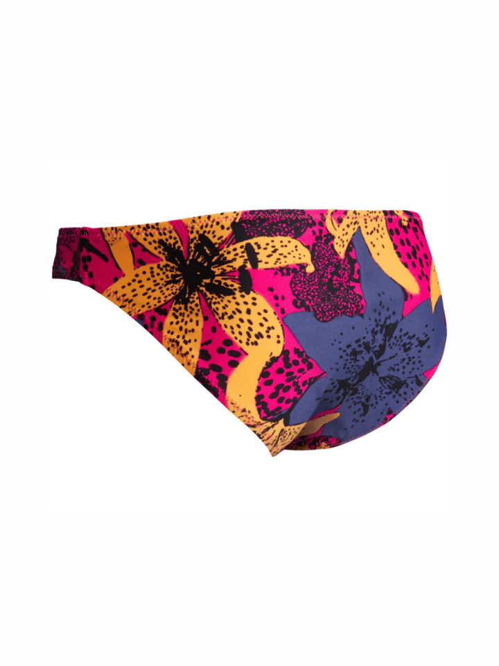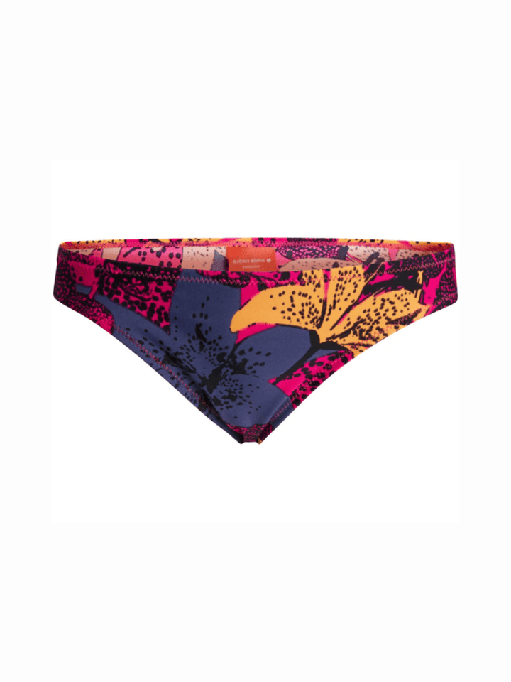 Pink - orange Björn Borg pige swim brief med sorte blomster motiver, perfekt pasform, Tørrer hurtigt. Det perfekte badetøj til pigerne.