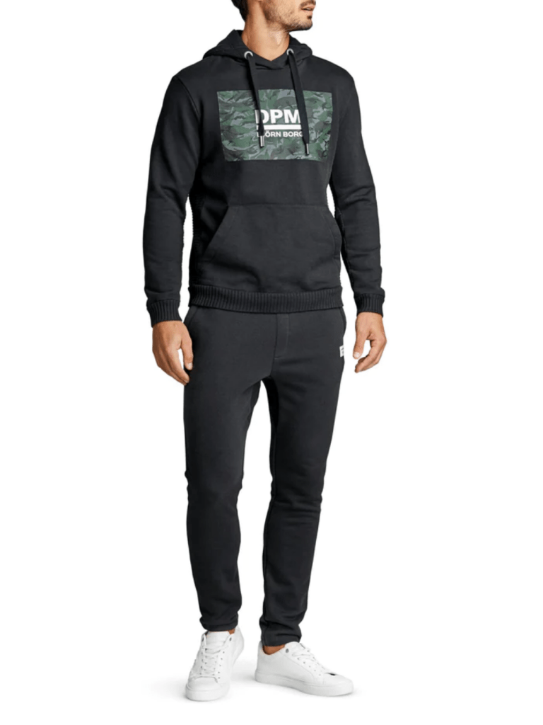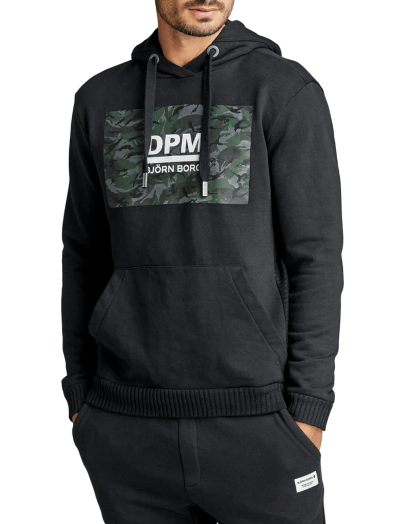 Björn Borg`s samarbejde med den London-baserede designer Hardy Maharishi Blechmans, blev bla. til denne sorte Björn Borg Dpm Hood. Den leveres i 100% bomuld, børstet frotté. Med et 3x3 sidepanel, 3x3 rib ved manchetterne, Kangaroo-lomme foran, justerbar hættesnor og et stort, camo DPM-logo på brystet.