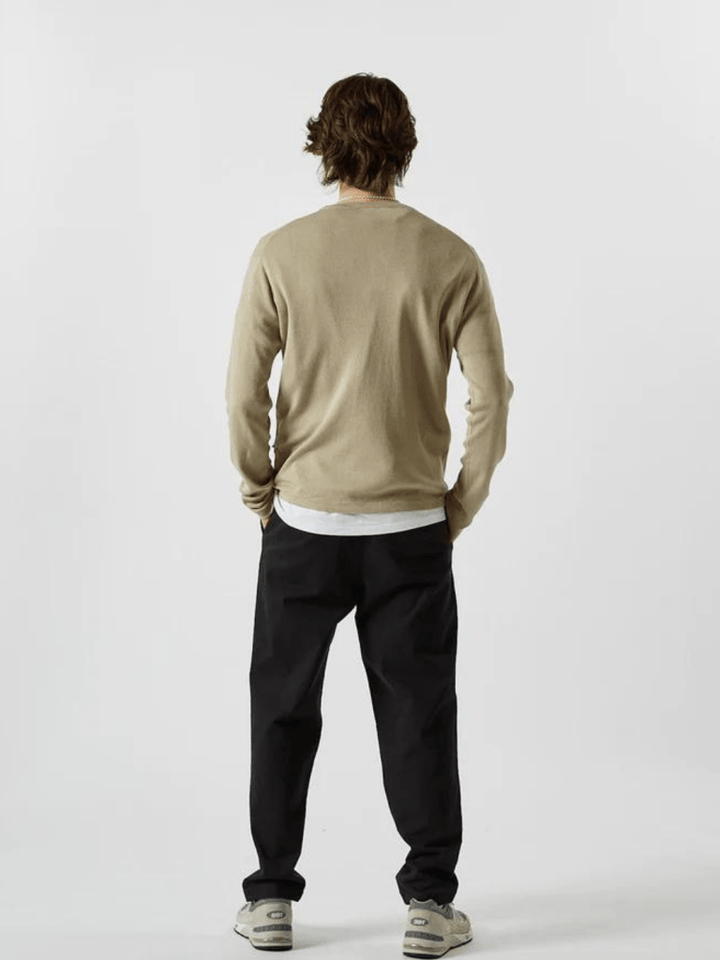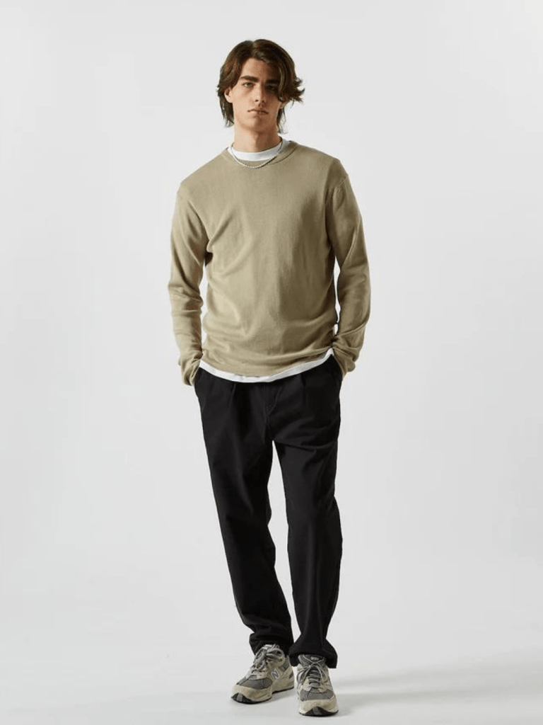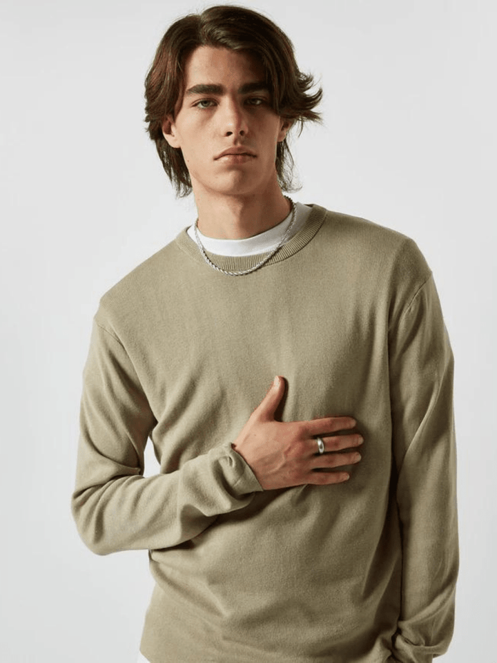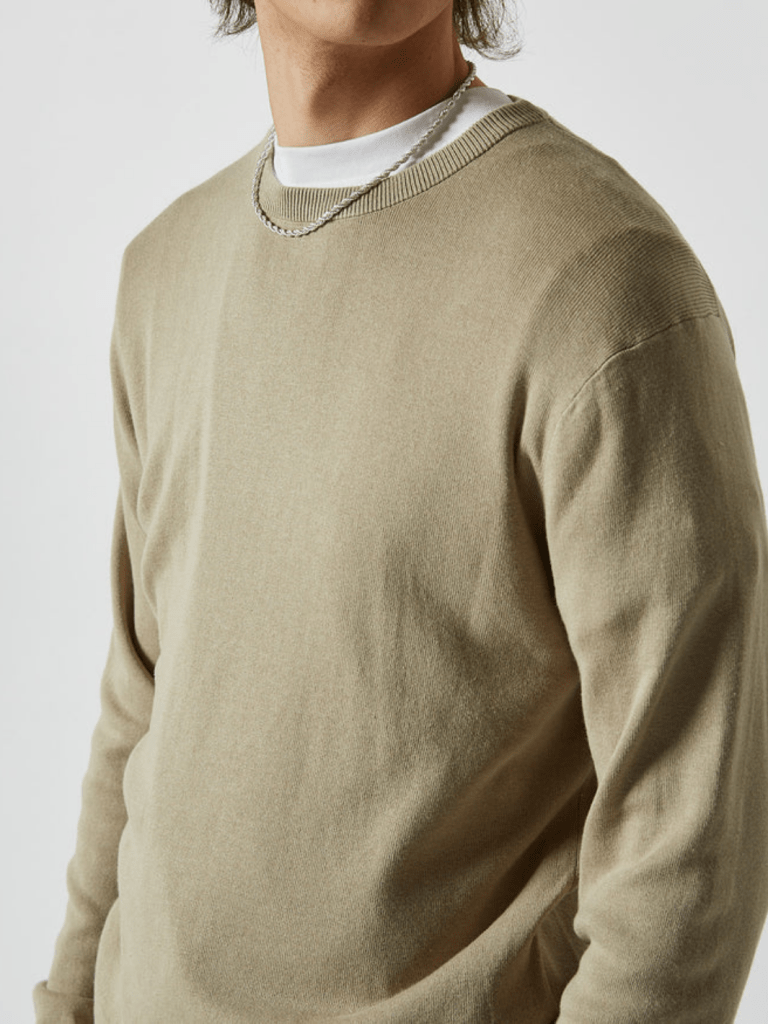 Langærmet Khaki Yason striktrøje fra minimum, fremstillet af økologisk bomuld og viskose for en blød og komfortabel kvalitet. Trøjen har en afslappet pasform og er designet med rund hals og ribkant ved kraven.