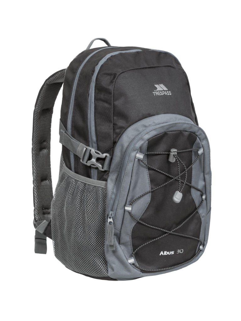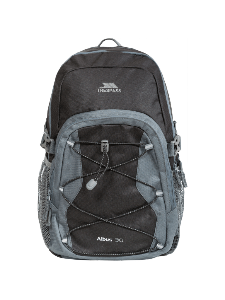 30 Liters Grå Trespass Albus rygsæk med ialt tre rum, og plads til flasker i siden. Elastikker på front, hvor du F.eks. kan spænde din jakke fast under vandreture.