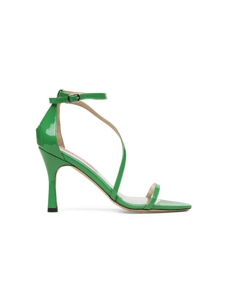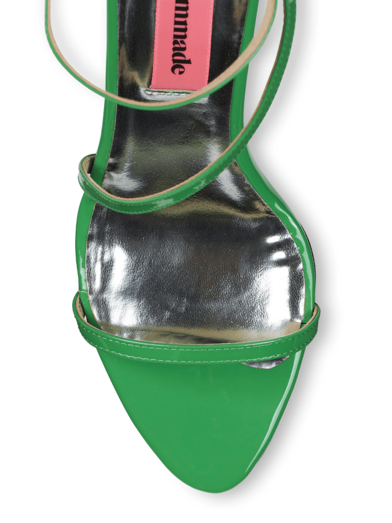 Smuk grøn Amy Stilet fra Custommade. Skoen har åben tå og lukkes med strop om anklen. Det er den perfekte festsko med et unikt design og en hæl på 9 cm. Den er normal i størrelsen. Håndlavet i Portugal.