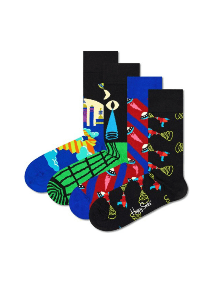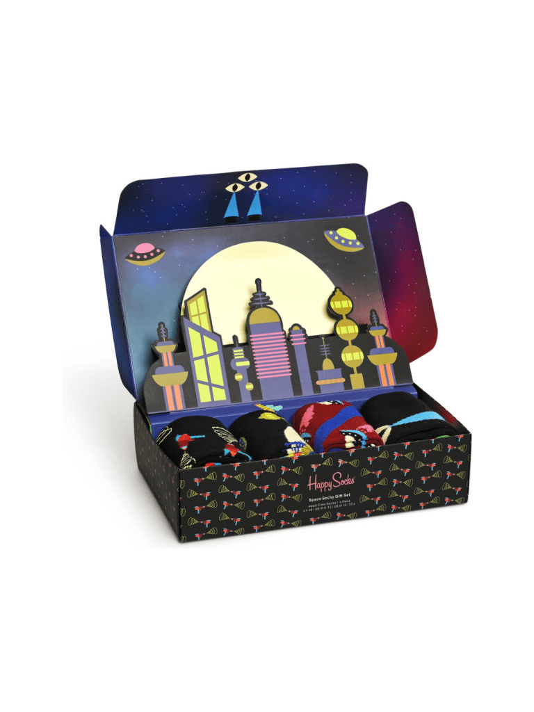 Happy socks 4-pack Gaveæske til herrer med rum tema. Rumpistoler, ufoer og mere i forskellige farver. Den perfekte gave til den kræsne , eller den smarte hipster. En sjov gave til en rum-elsker