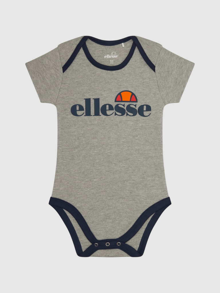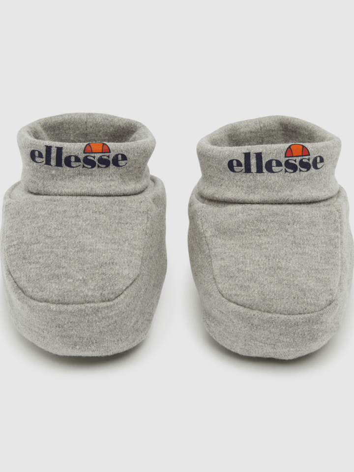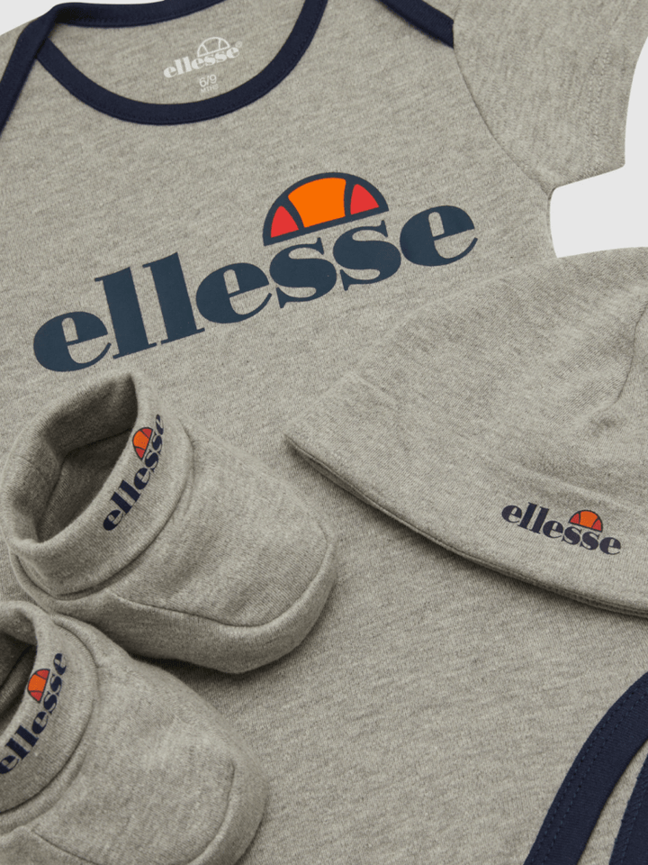 Gråt Ellesse Baby sæt, bestående af body, sko samt hue. Body med ekstra forstærkning ved kanter. Hue med logo, og sko med logo.