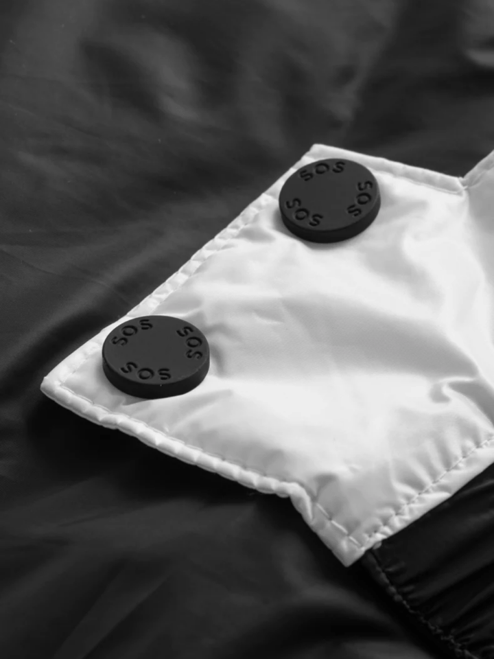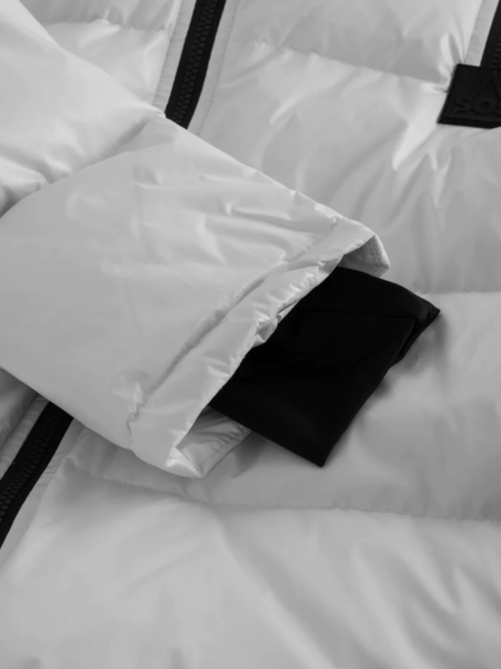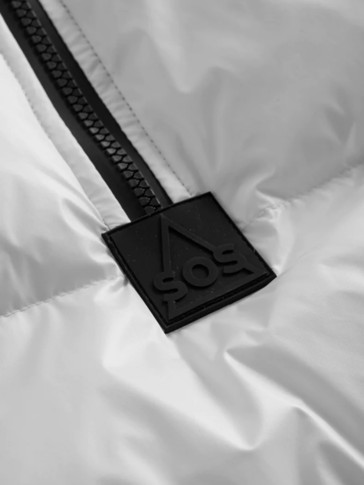 Hvid SOS Vincent dunjakke med asymetrisk frontlynlås, lomme på ærme, samt to sidelommer med skrå lynlåse. Mindre inderlomme med vaskeskind i elastik snor til pudsning af brillerne, samt snefang, og snortræk i talje. Derudover snefang i ærmer med hul til tommelfinger. Det laminerede skalstof er behandlet med C6 DWR og leveres med Vislon Aquaguard lynlåse, der hjælper dig med at holde dig varm og tør.