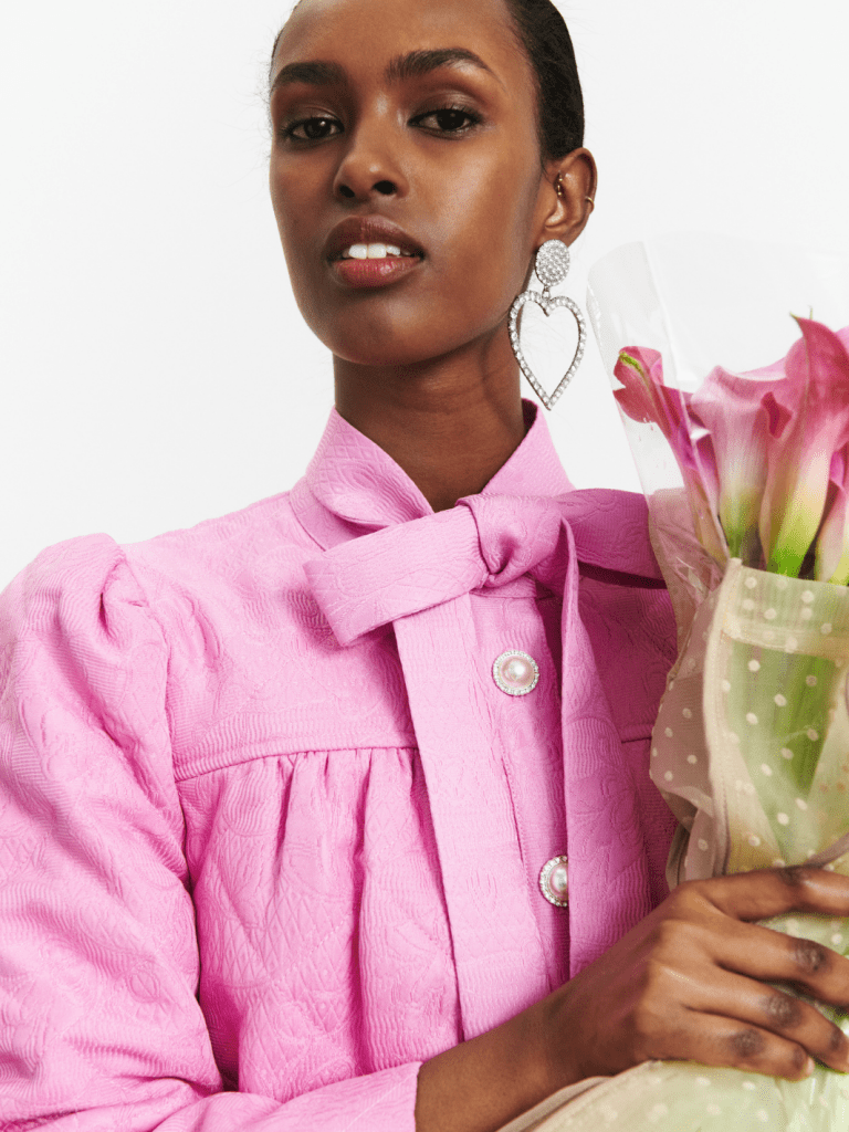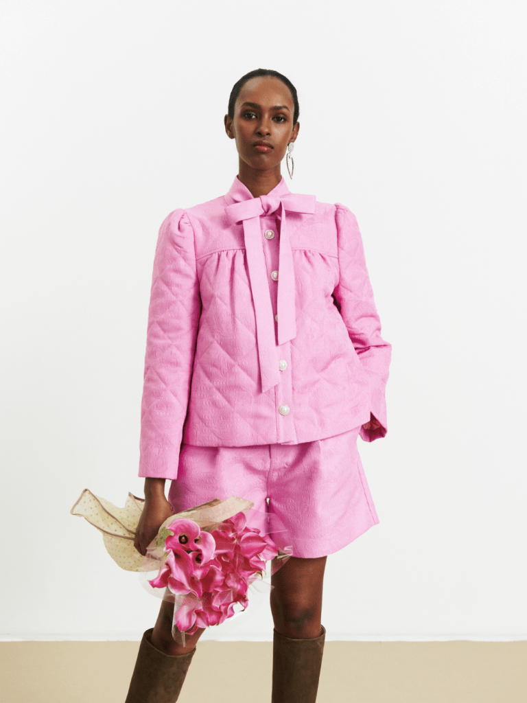 Skil dig ud med den smukke, mønstrede pink Guiseppa jakke fra Custommade. Rund halsudskæring, lange ærmer og krystalknapper giver et eksklusivt look, mens bindebåndet i halsen skaber elegance. Perfekt til enhver lejlighed!
