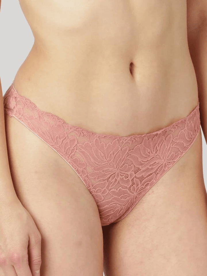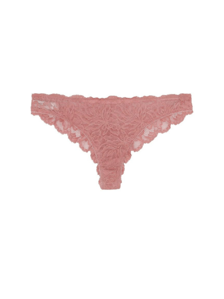Rosa Dear Denier blonde Tanga. Lavet af den blødeste italienske stræk-blonde med blomstermotiv. Den har en mellem-høj talje og blonden er lavet udelukkende med genanvendte materialer og har smukke bølgende kanter. Designet er sømløst på bagsiden, så de er usynlige under tøjet.