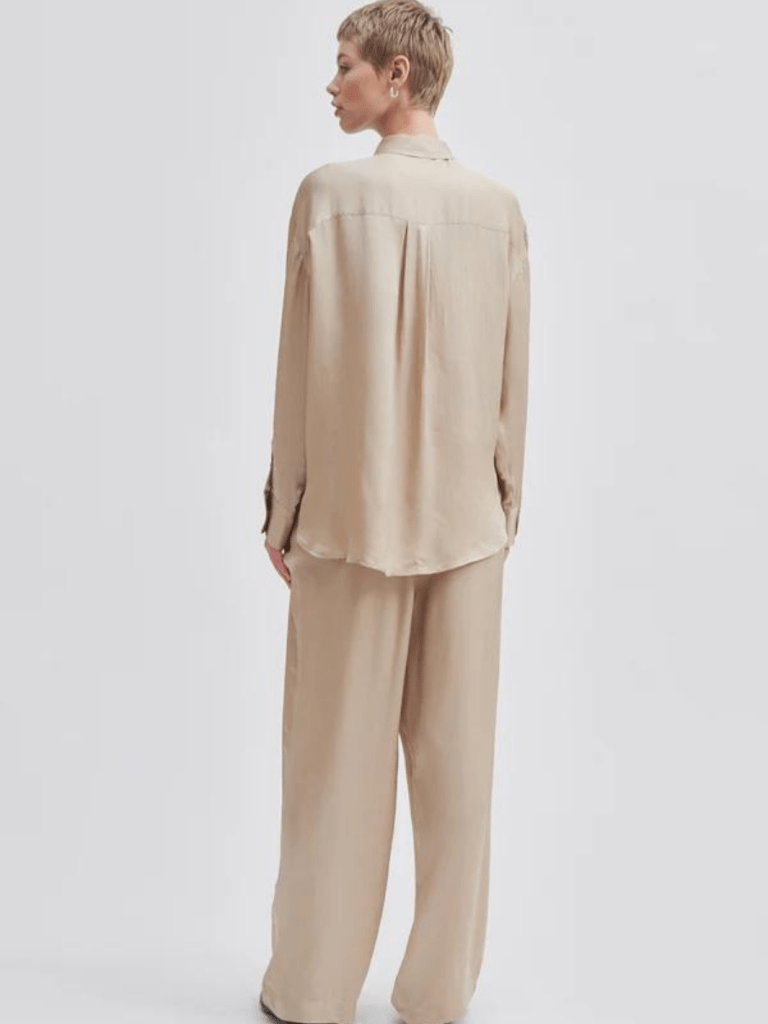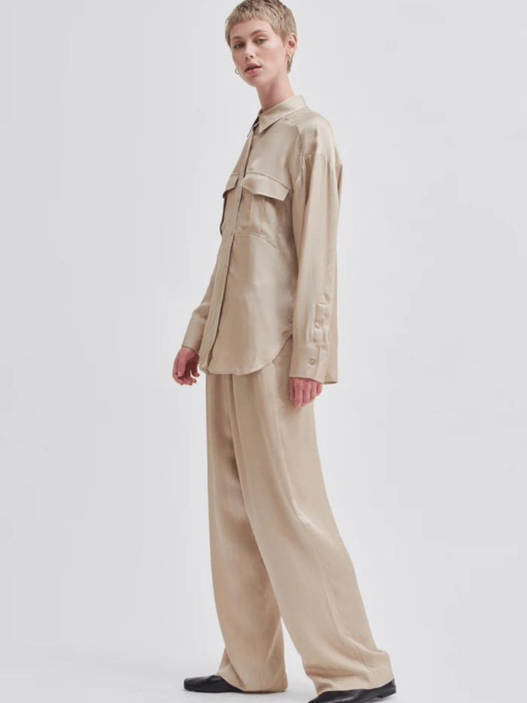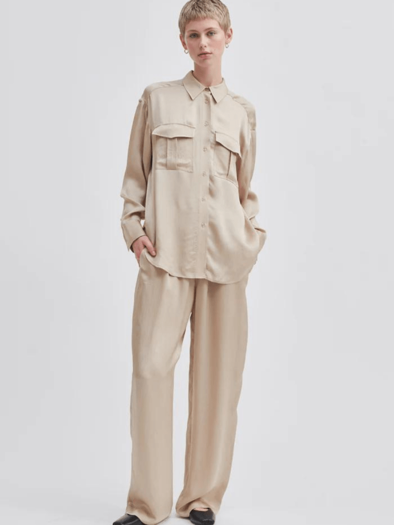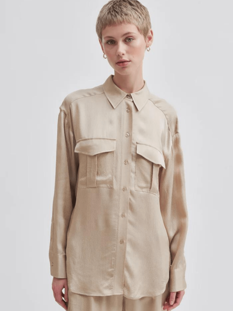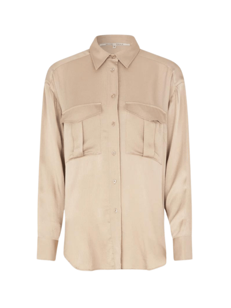 Sandfarvet Second Female Noma Skjorte. Fremstillet i det blødeste viskose med vaflet struktur. Krave, gennemgående knaplukning. Lange ærmer med manchetter og knapper. To brystlommer med flapper. Afslappet pasform.