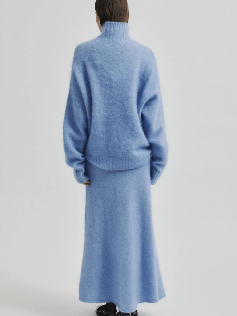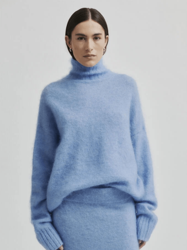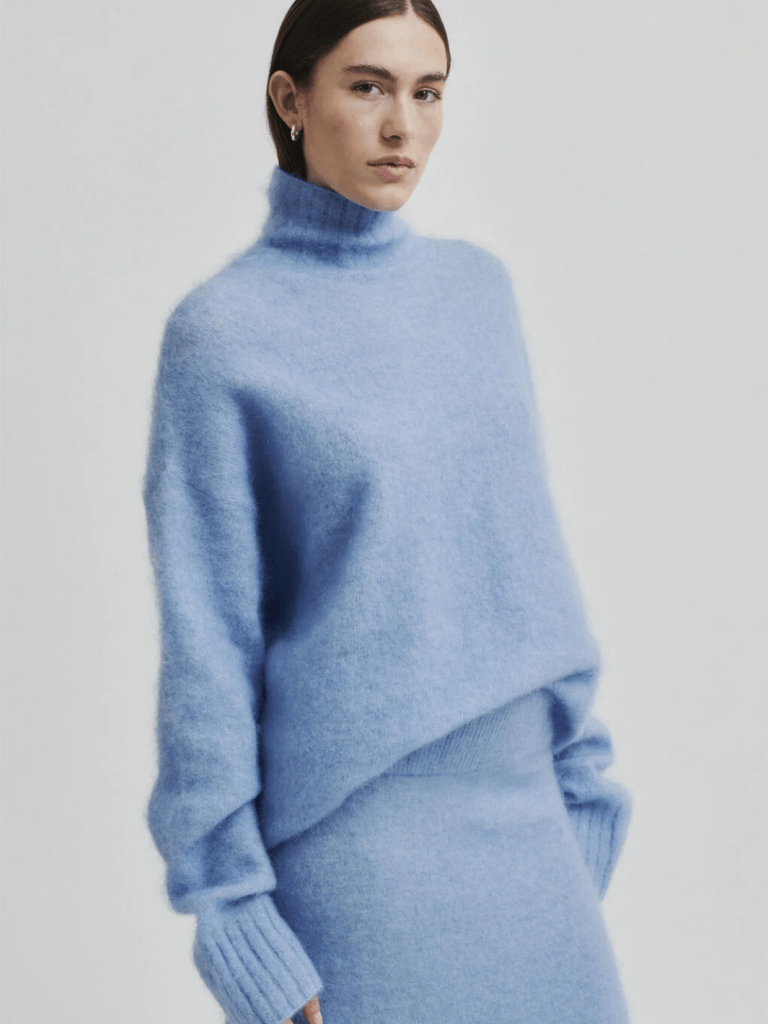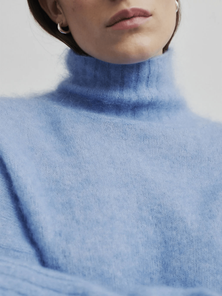 Luksuriøs lyseblå Ina turtleneck strik fra Second Female. Strikket i en let, blød og elastisk uldblanding. Den har en afslappet, oversize pasform med høj hals, lave skuldre. Ribkant i hals, ærmer samt linning. Det perfekte valg til at løfte vintergarderoben og holde dig varm med stil på kolde dage.