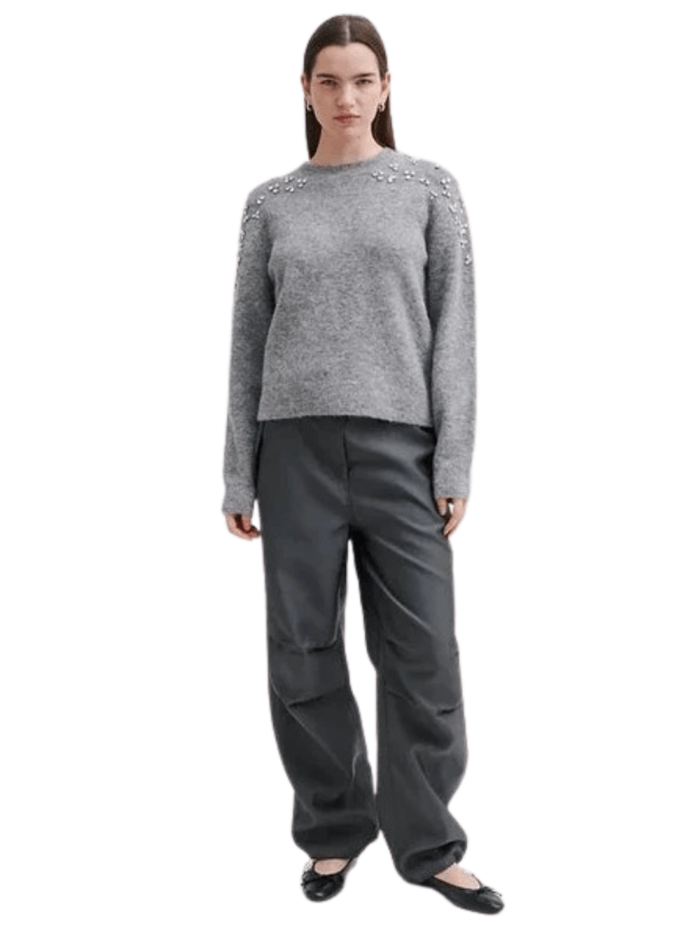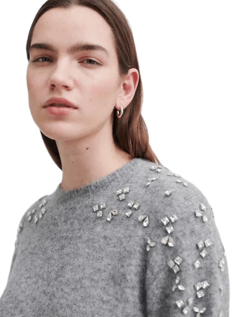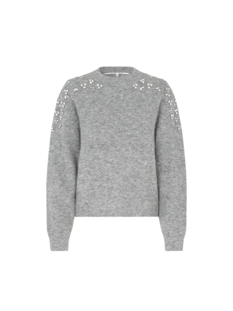 Second Female Lysegrå Sparkling O-Neck Strik, som er udsmykket med fine pailletter. Strikken er blød og strækbar, lavet i en alpaka-merino blanding. Halsen er rund og sweateren har lange ærmer med løs pasform.