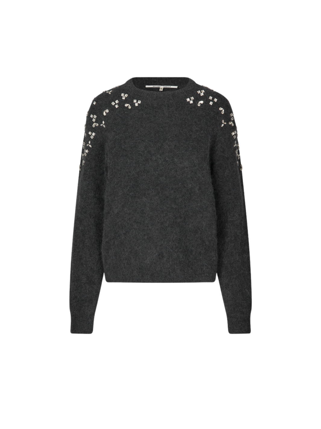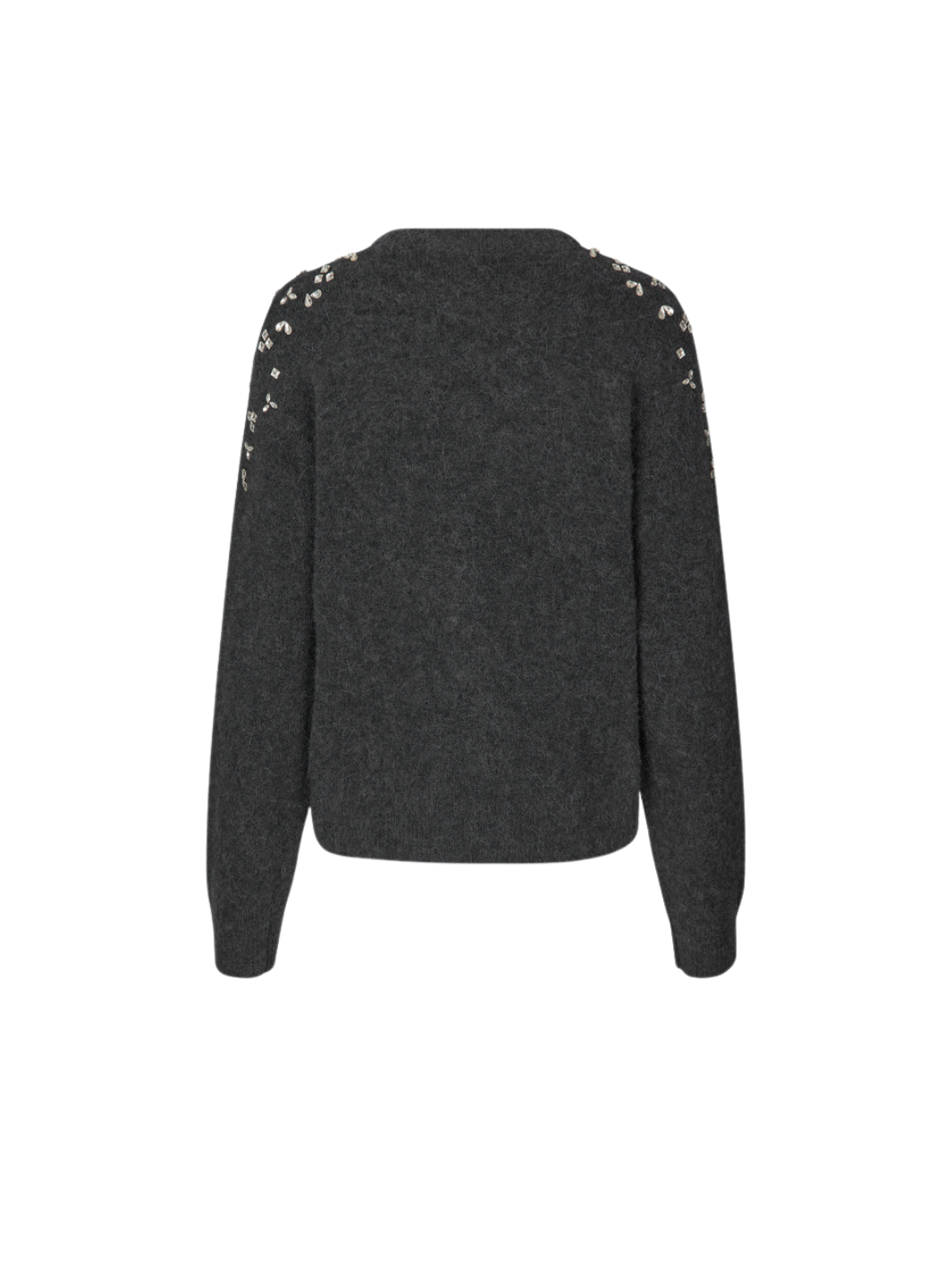 Second Female mørkegrå Sparkling O-Neck Strik, som er udsmykket med fine pailletter. Strikken er blød og strækbar, lavet i en alpaca-merino blanding. Halsen er rund og sweateren har lange ærmer med løs pasform.