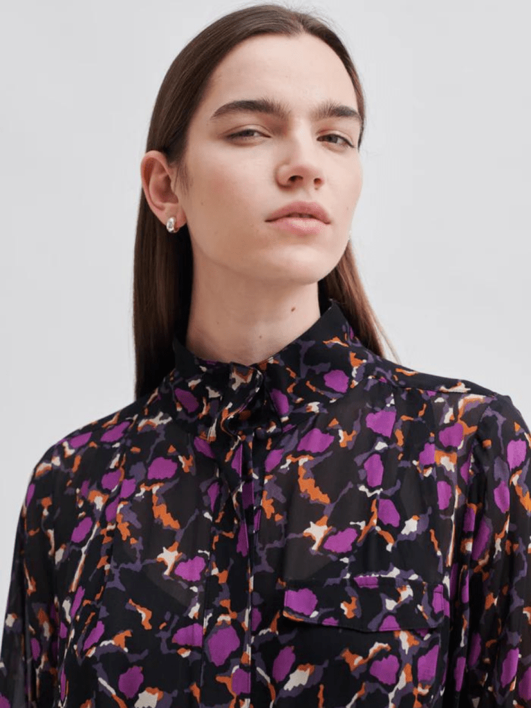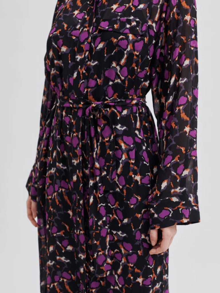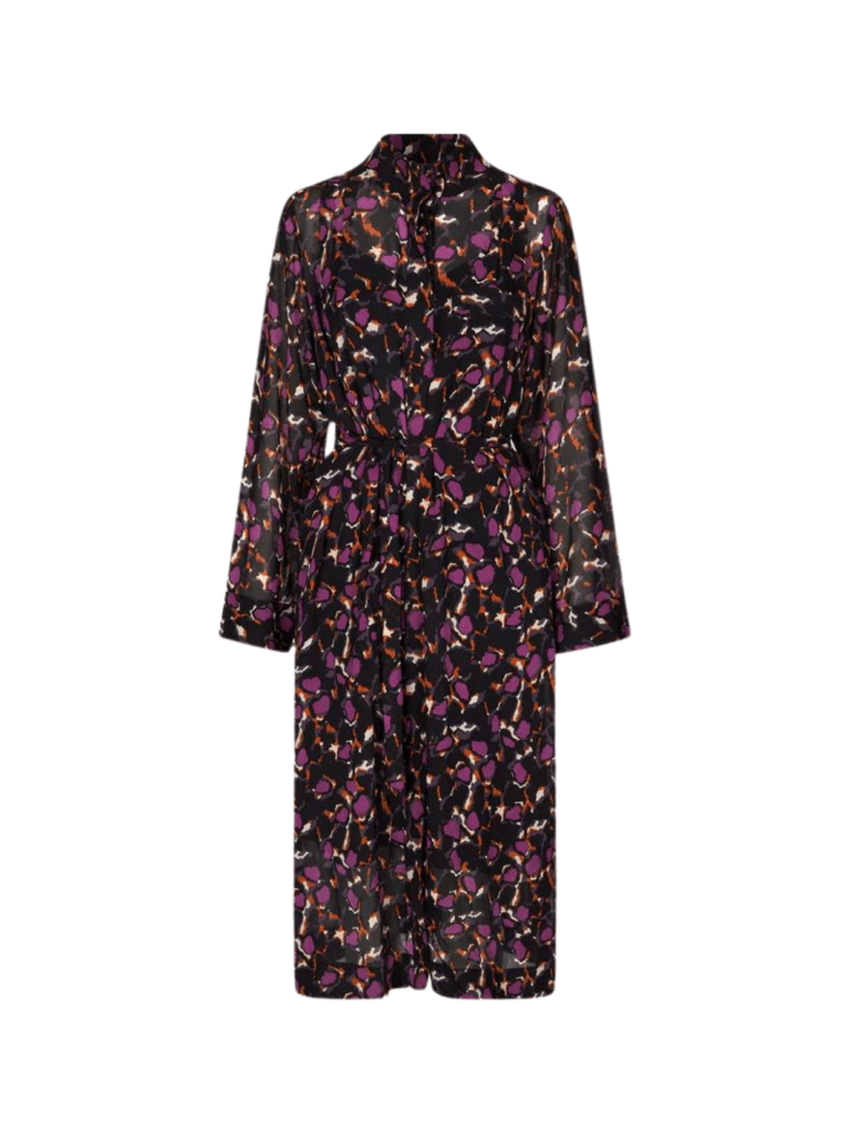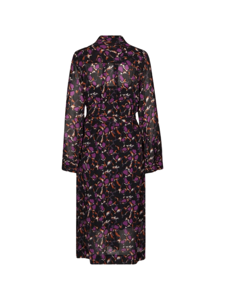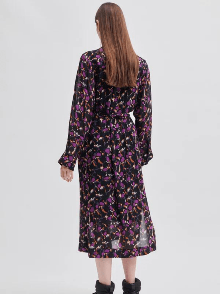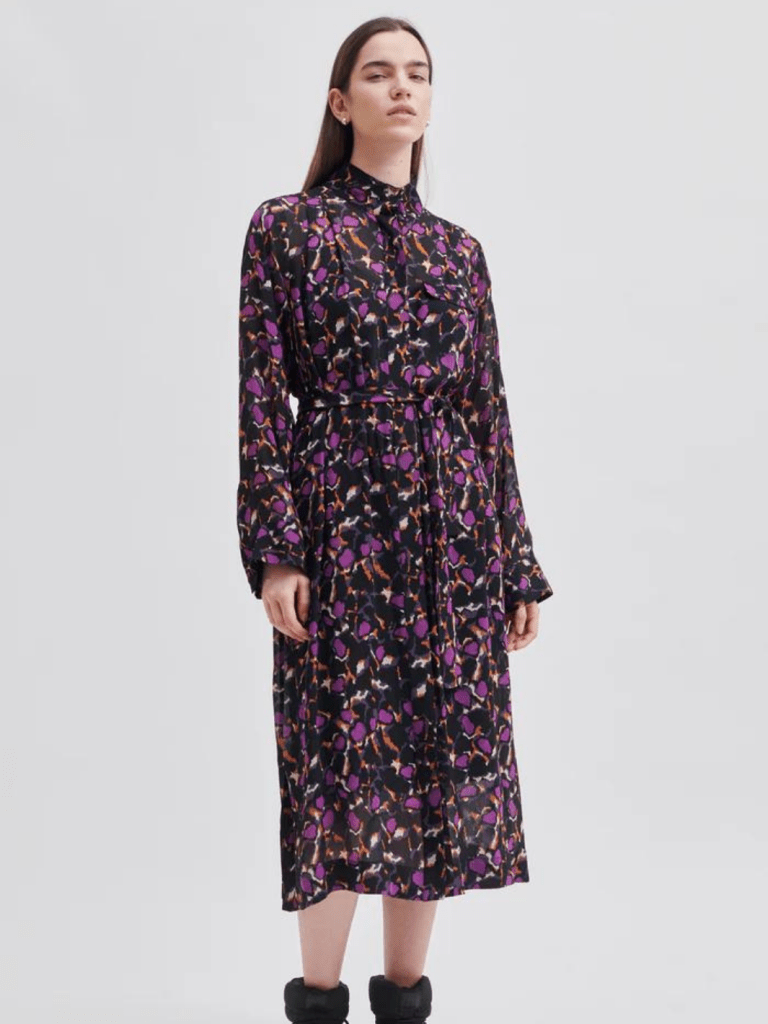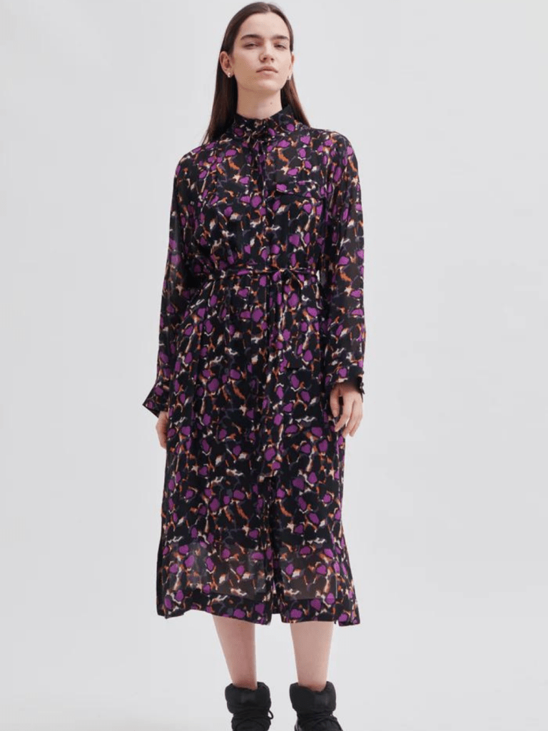 Sort Mønstret Second Female Point Shirt Kjole. Fremstillet i let viskose med mønster. Aftagelig underkjole med tynde, justerbare skulderstropper, og skjulte, betrukne knapper. Lommeklap på bryst og to lommer i siden. Bindebælte i taljen. Lange ærmer med justerbar knaplukning ved manchetterne. Læggede detaljer på skuldrene. Slidser i siderne. Løs pasform, som kan samles med bæltet for at give mere markeret talje.