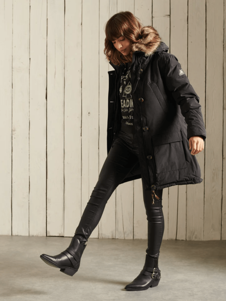 Sort Superdry Dame Parka vinterjakke med hætte og aftagelig "fake" pels, høj hals med ekstra lukning og hætte med snortræk. Yderstoffet er nylon, foret med dun og fjer. Der er fire nedre sidelommer og to øvre lommer med knapper, kraftig front lynlås, og ekstra luk med knapper. Desuden kraftig strikket rib i ærmer og mindre logo ved skulder. En Fantastisk god og varm Jakke til de kolde måneder.