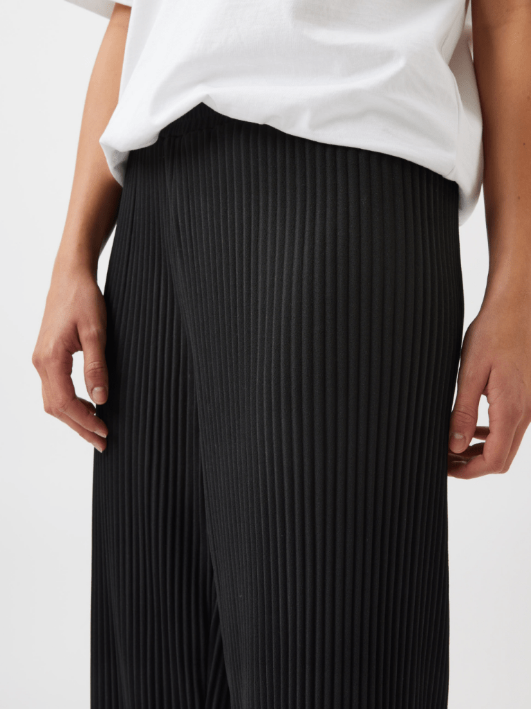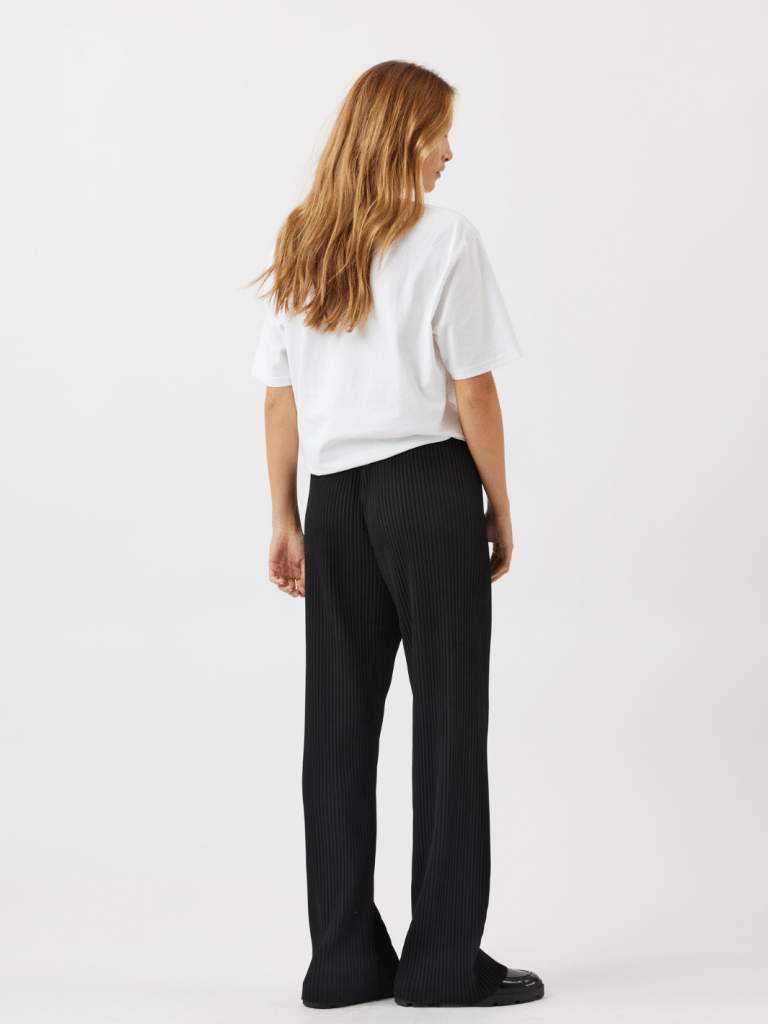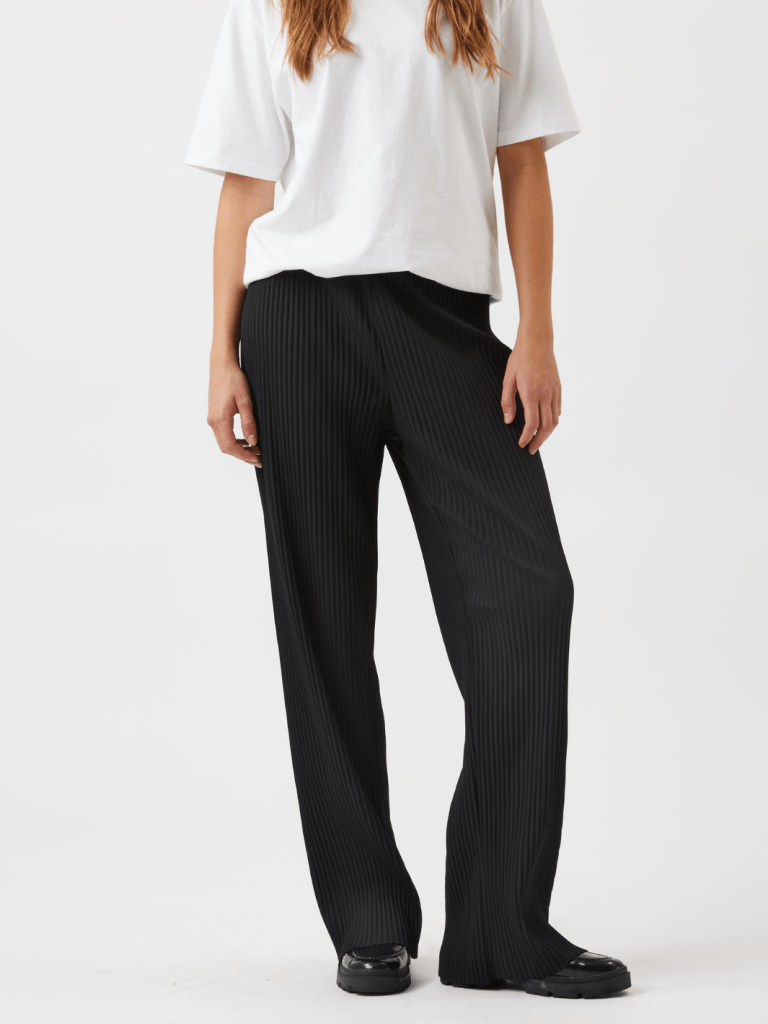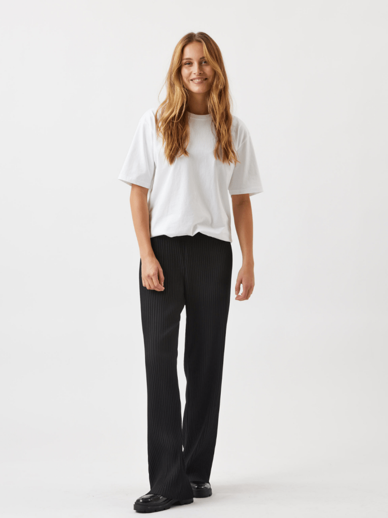 Sorte Minimum Sjanni bukser, fremstillet af genanvendt polyester og elastan for en let og strækbar kvalitet. Bukserne har en afslappet pasform og er designet i en bølget kvalitet med elastik i taljen. Modellen er er 177 cm høj og bruger en 36
